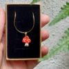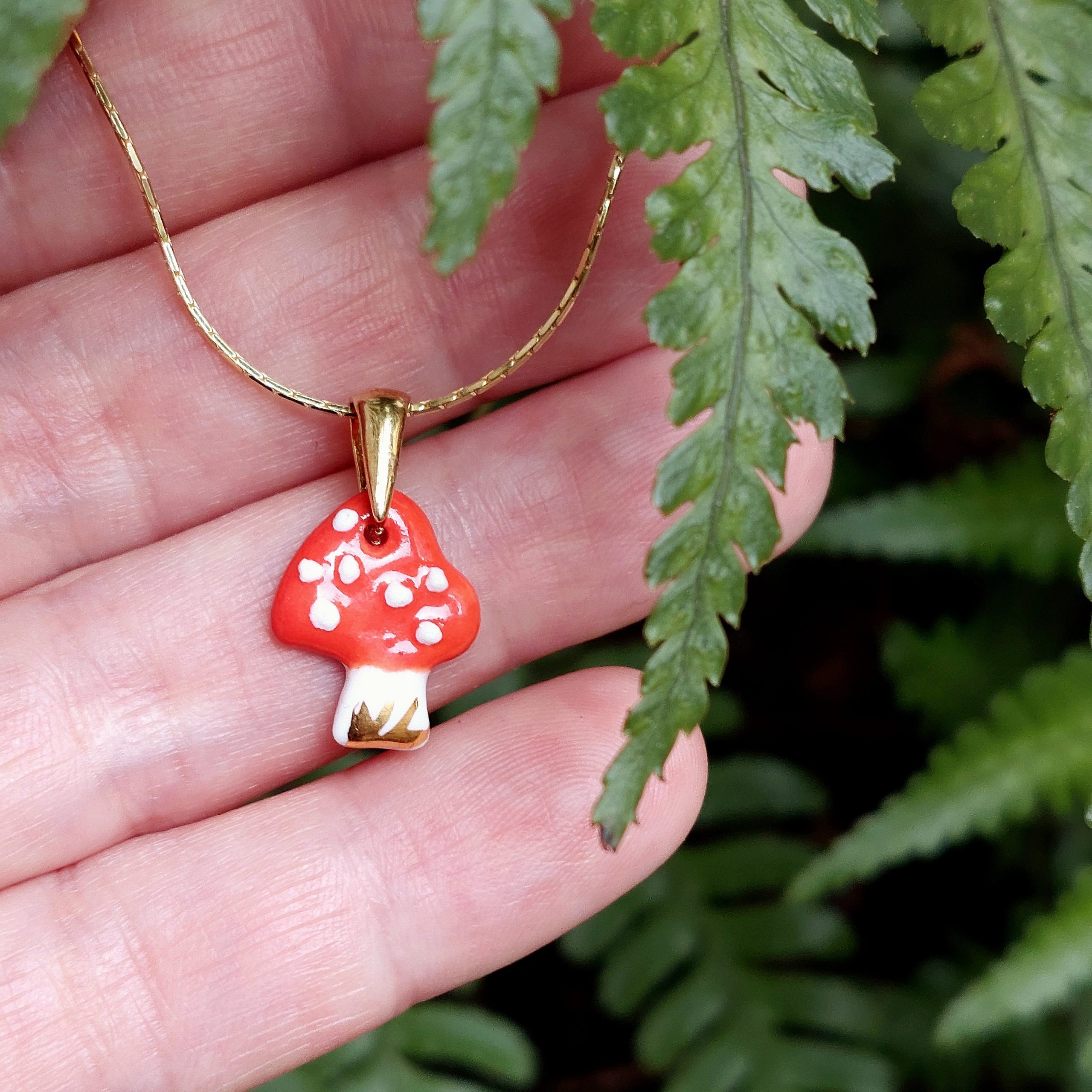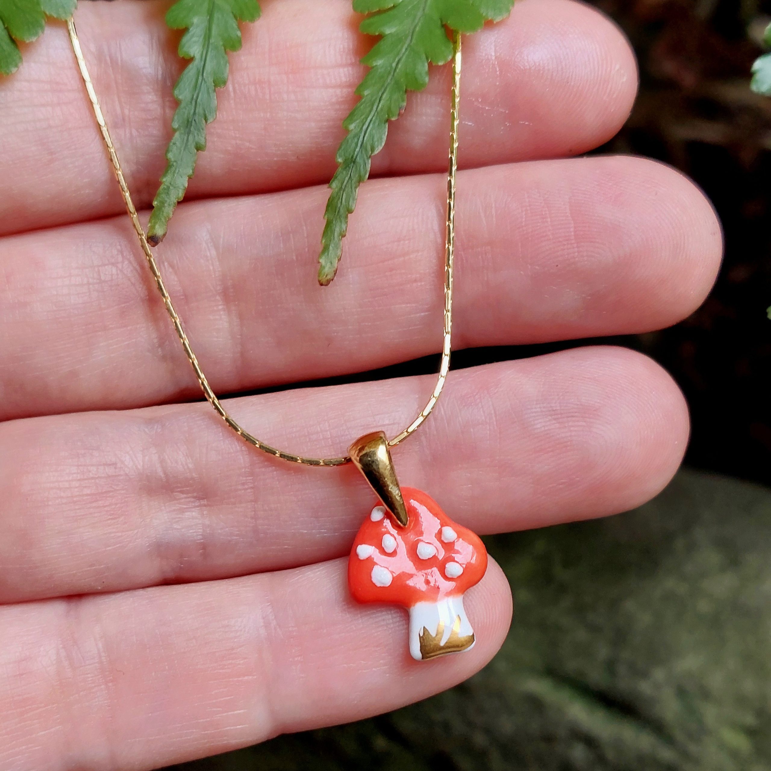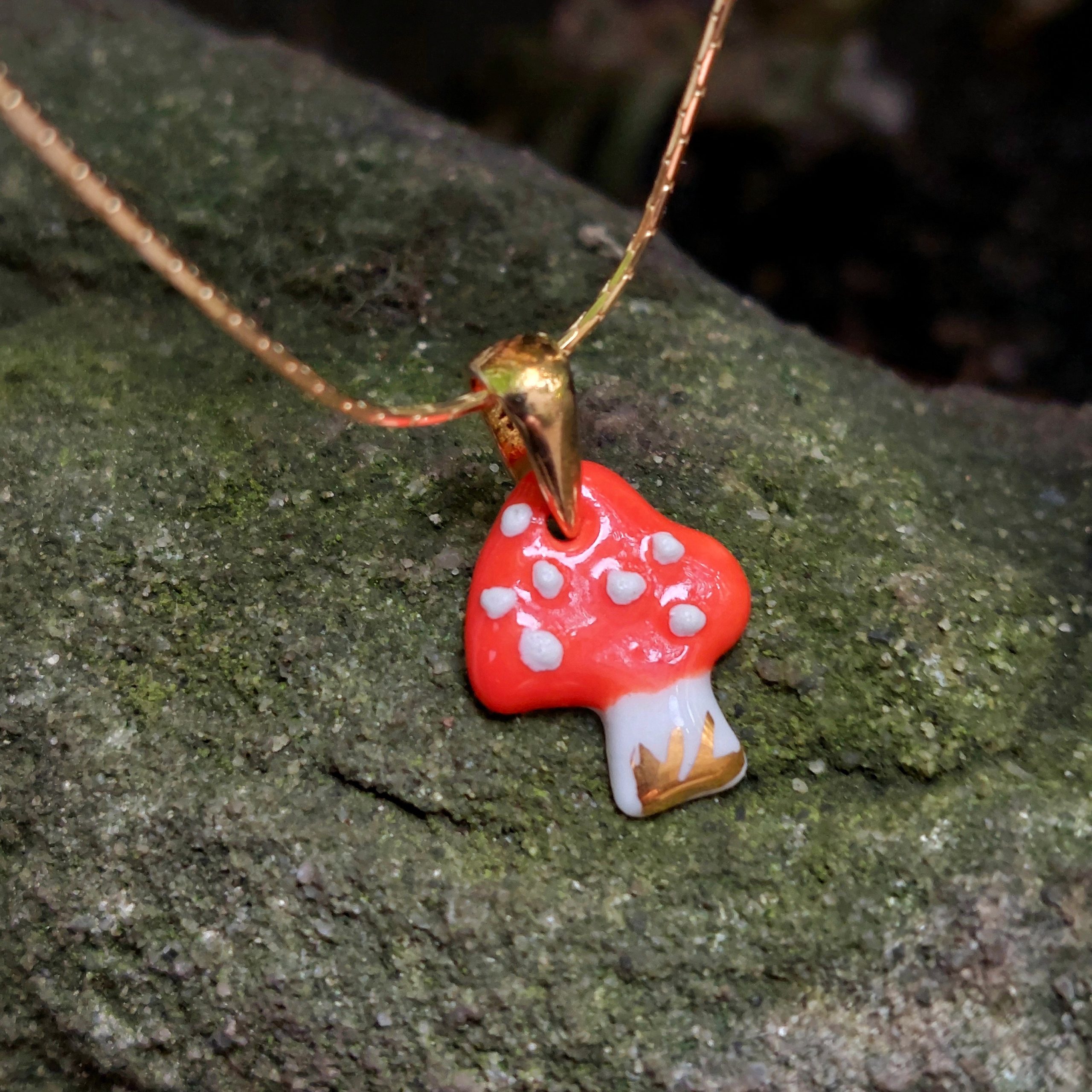 Handmade decoration in the UUli Ceramics and Porcelain workshop. The pendant is hand-formed, painted with ceramic glaze, smoothed and finally decorated with liquid 24-carat gold, mounted on a gold-plated silver pendant complete with a 45 cm long gold-plated silver chain. Pendant dimensions: toadstool height of about 15 mm, width of about 14mm