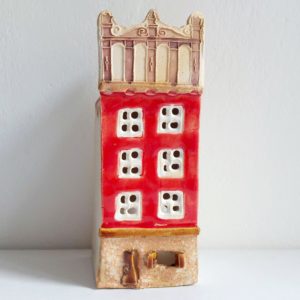 ceramic lantern tenement house with a hole for a low tealight candle. Lantern dimensions: height approx. 16 cm, width 6 cm, depth 6 cm.