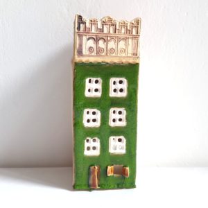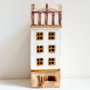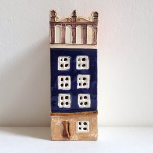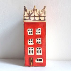 ceramic lantern tenement house with a hole for a low tealight candle. Lantern dimensions: height approx. 16 cm, width 6 cm, depth 6 cm.