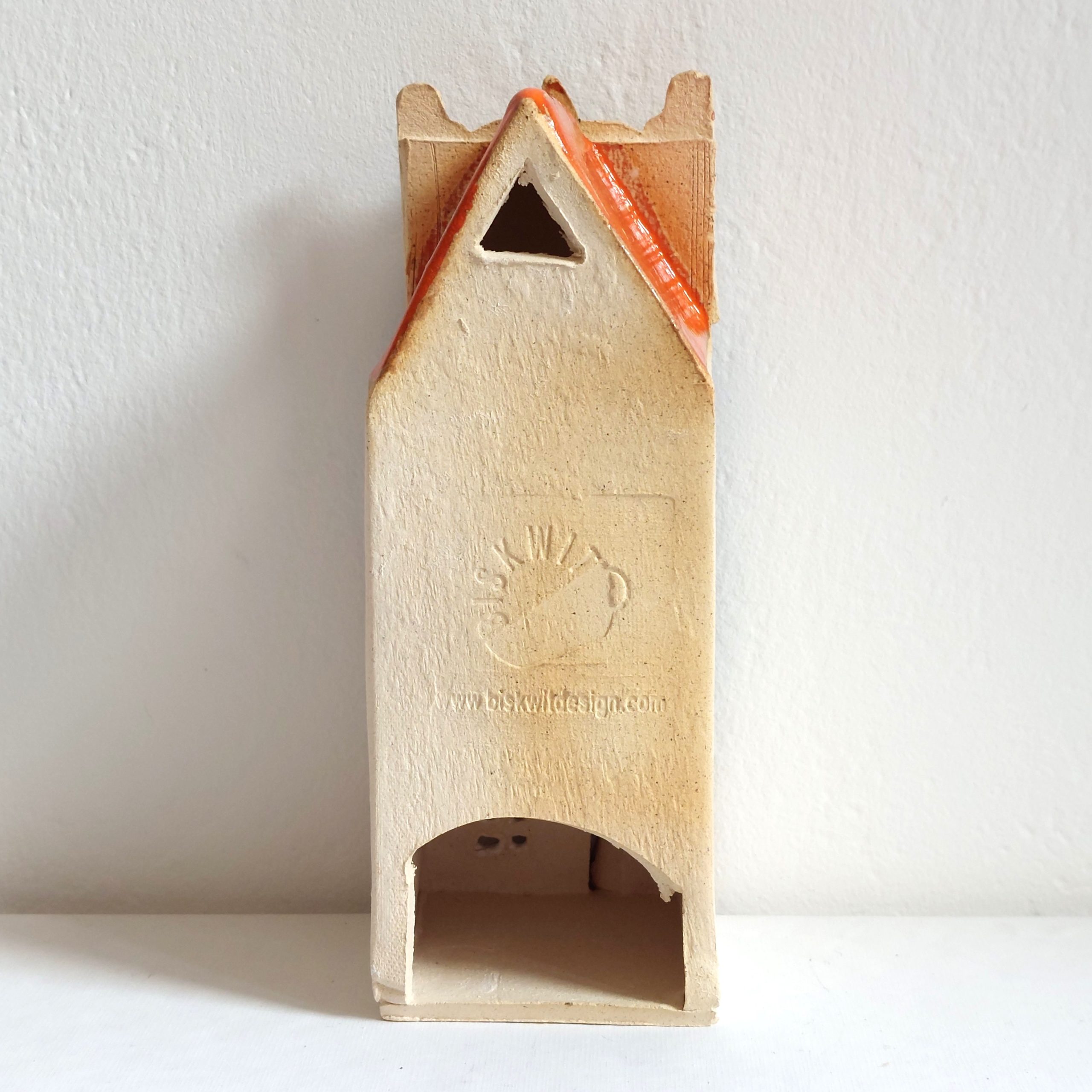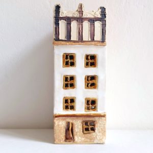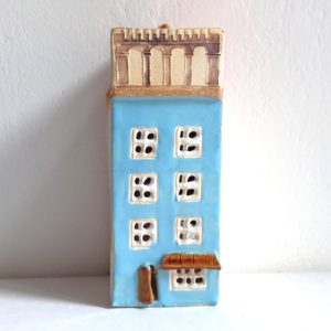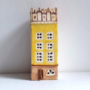 ceramic lantern tenement house with a hole for a low tealight candle. Lantern dimensions: height approx. 16 cm, width 6 cm, depth 6 cm.
