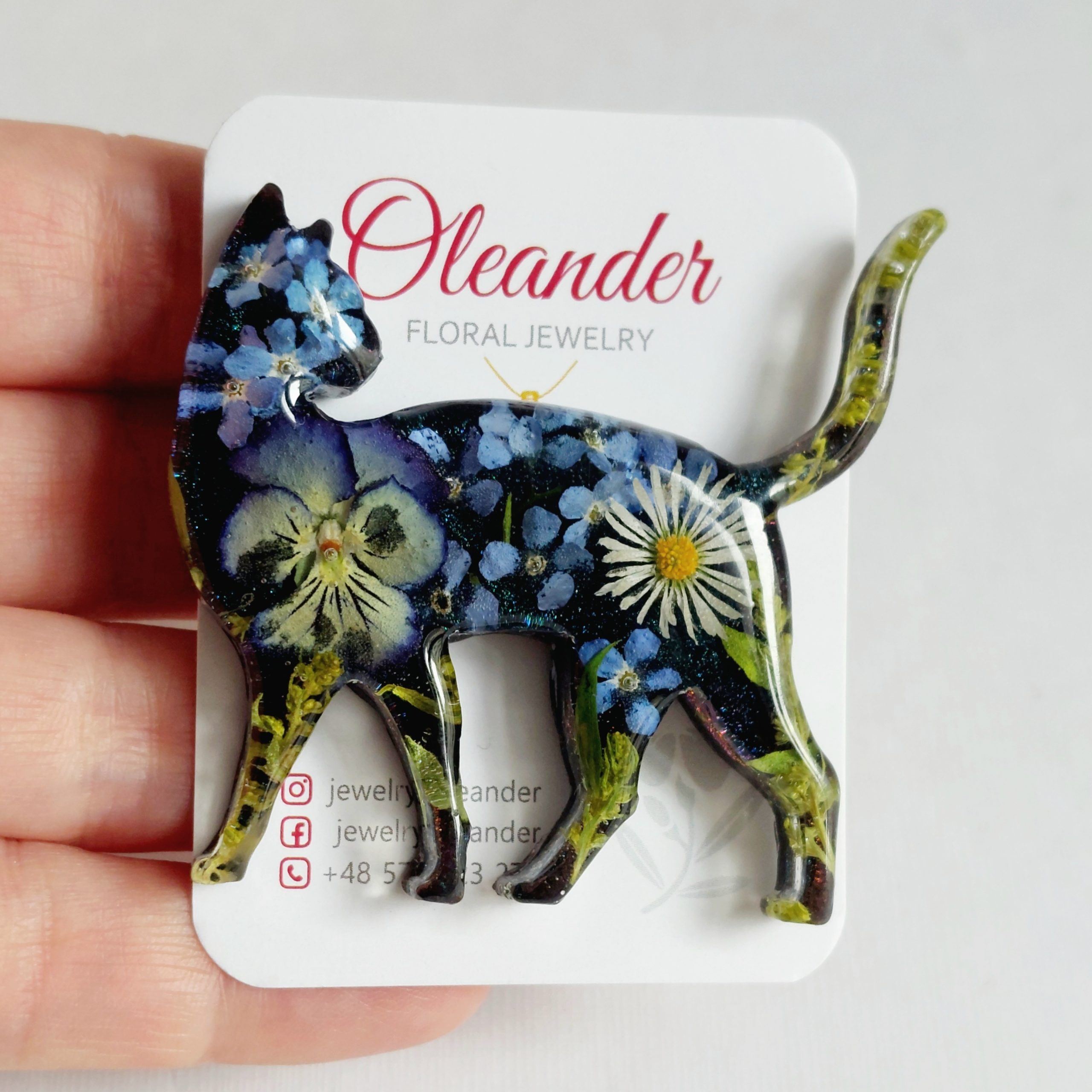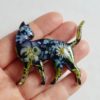 broszka wykonana z prawdziwych suszonych kwiatów zatopionych w żywicy epoksydowej w kształcie kota. Zapięcie agrafka ze stali szlachetnej. Wymiary: wysokość 5,5 cm, szerokość 5,5 cm