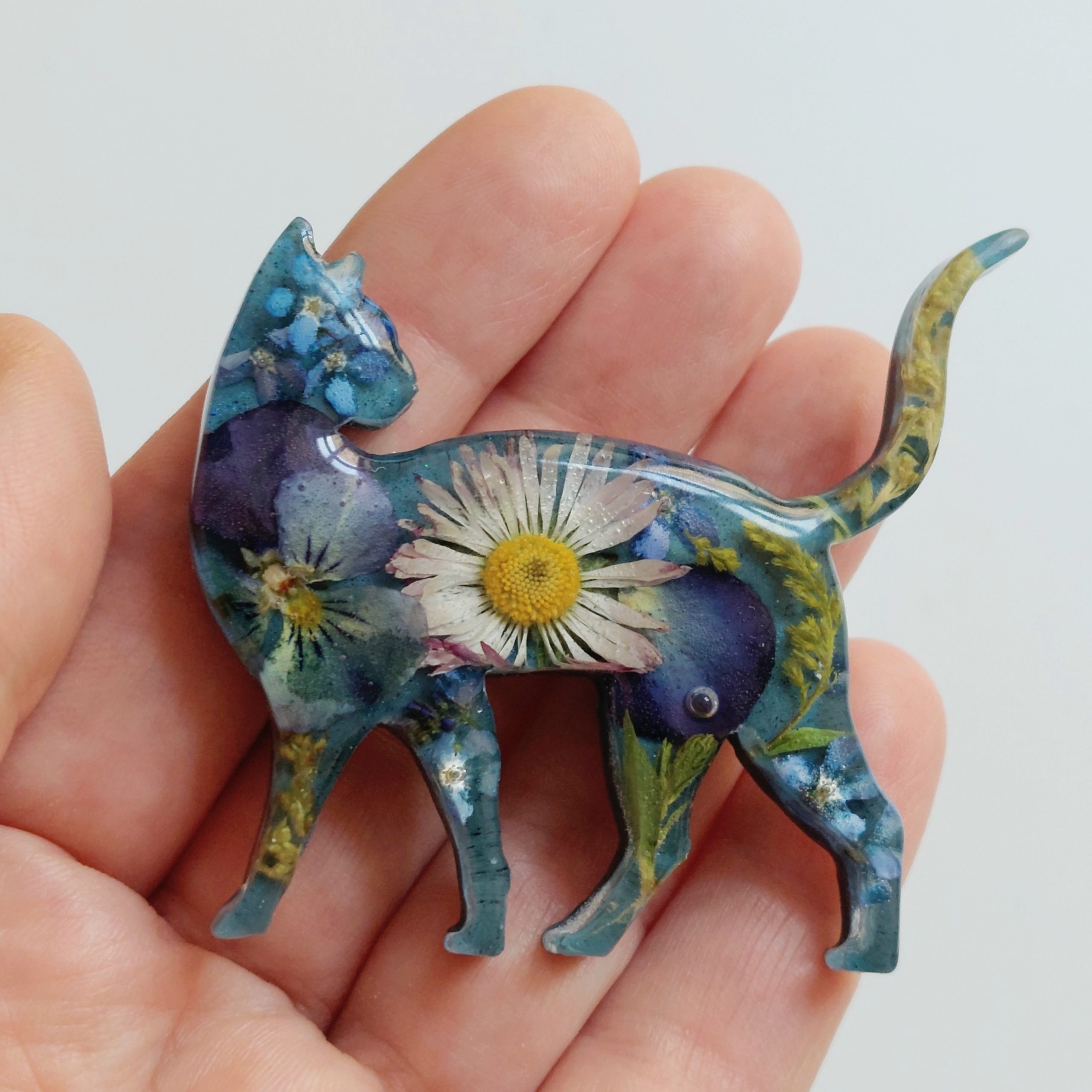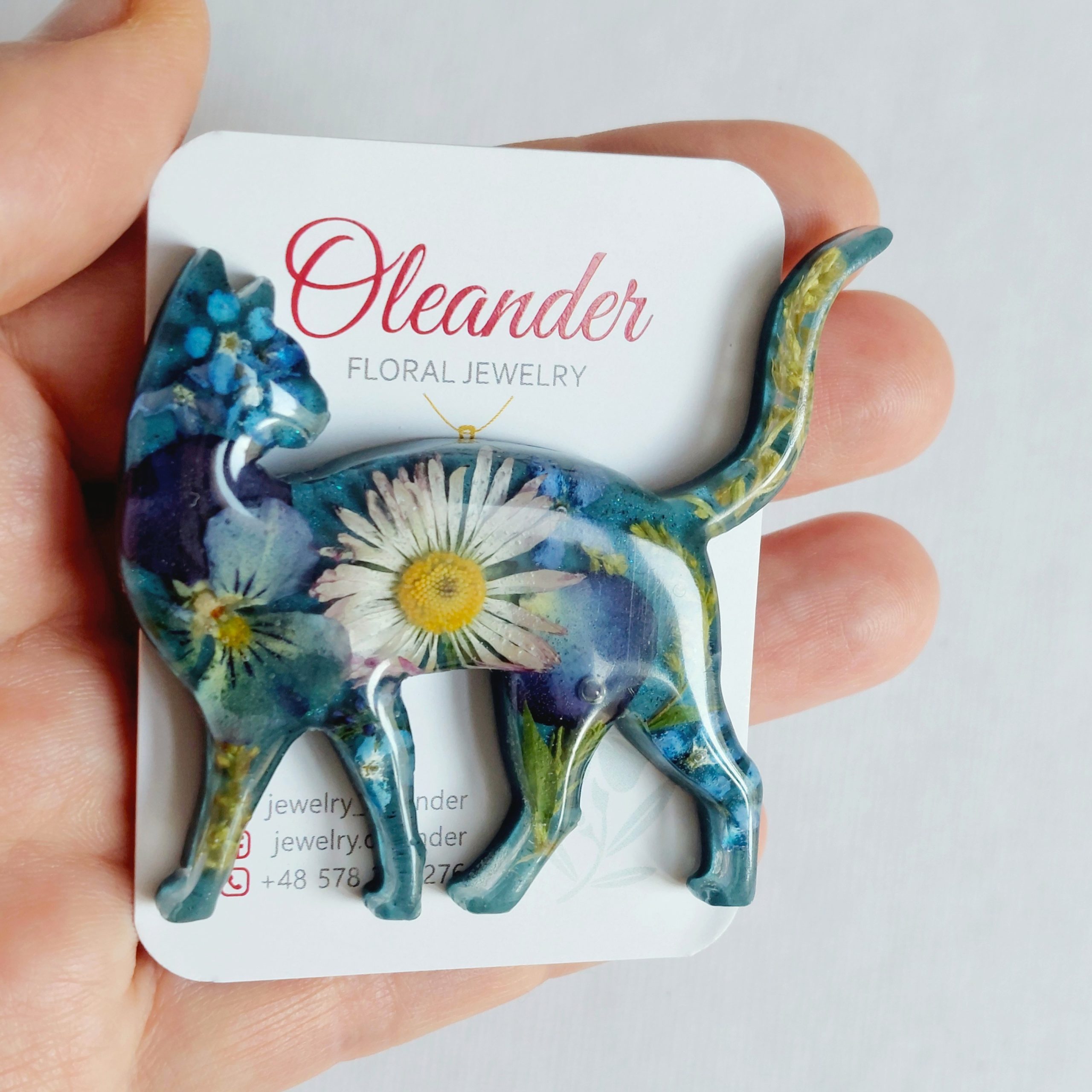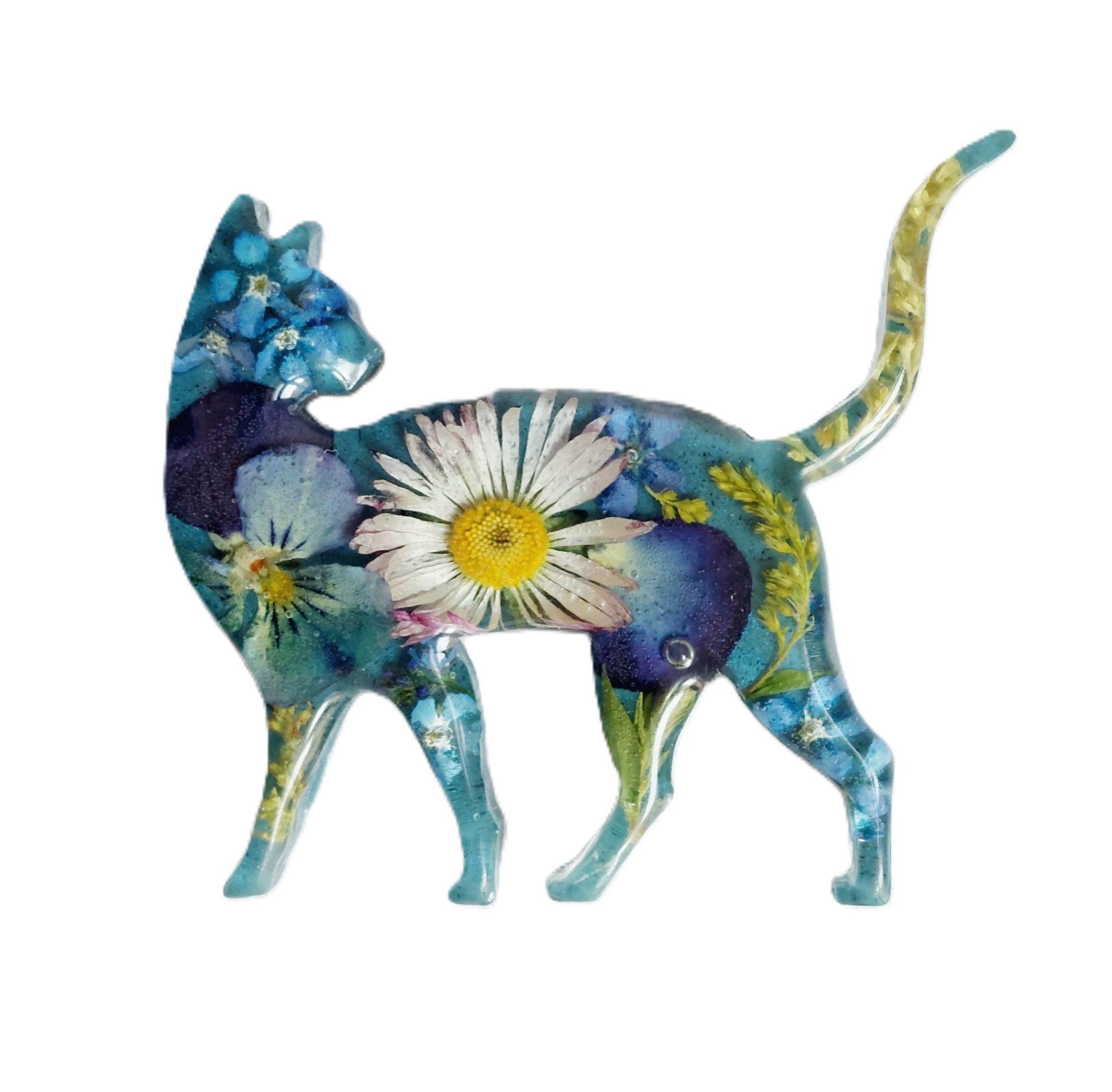 broszka wykonana z prawdziwych suszonych kwiatów zatopionych w żywicy epoksydowej w kształcie kota. Zapięcie agrafka ze stali szlachetnej. Wymiary: wysokość 5,5 cm, szerokość 5,5 cm
