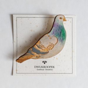 drewniana broszka, ręcznie malowana na podstawie autorskiego rysunku, wykonana w pracowni ilustracji Dwukroopek. Broszka jest zabezpieczona cienką warstwą lakieru, zapinana na agrafke, wymiary: wysokość 4,5 cm, szerokość około 8 cm