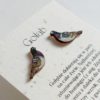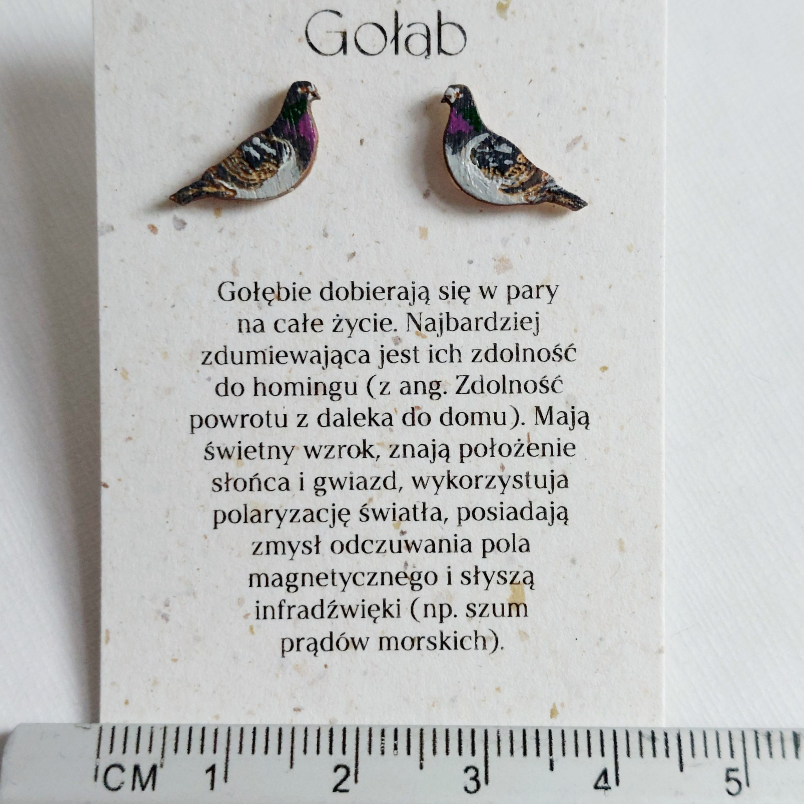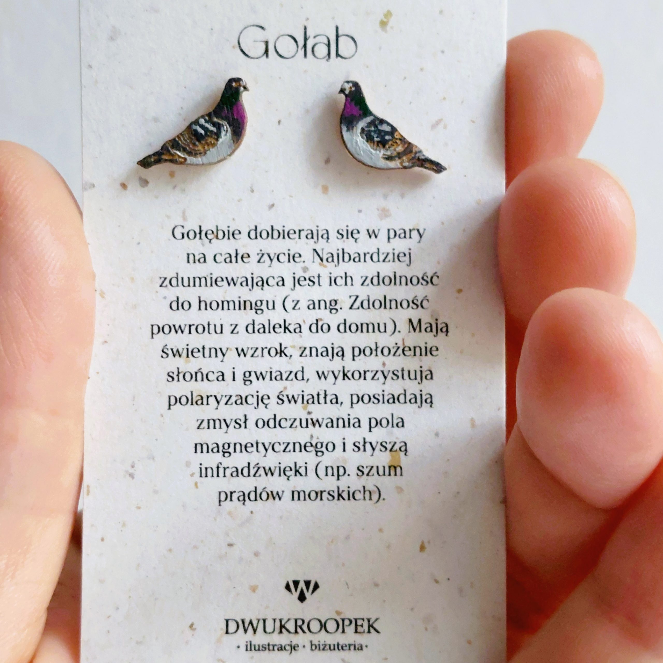 ręcznie malowane kolczyki w pracowni ilustracji DWUKROOPEK. Kolczyki wykonane z drewna według autorskiego rysunku, ręcznie malowane i na koniec zabezpieczone przed wilgocią specjalną powłoką. Sztyfty wykonane z antyalergicznego silikonu. Wielkość kolczyków: wysokość 8mm, szerokość 11mm