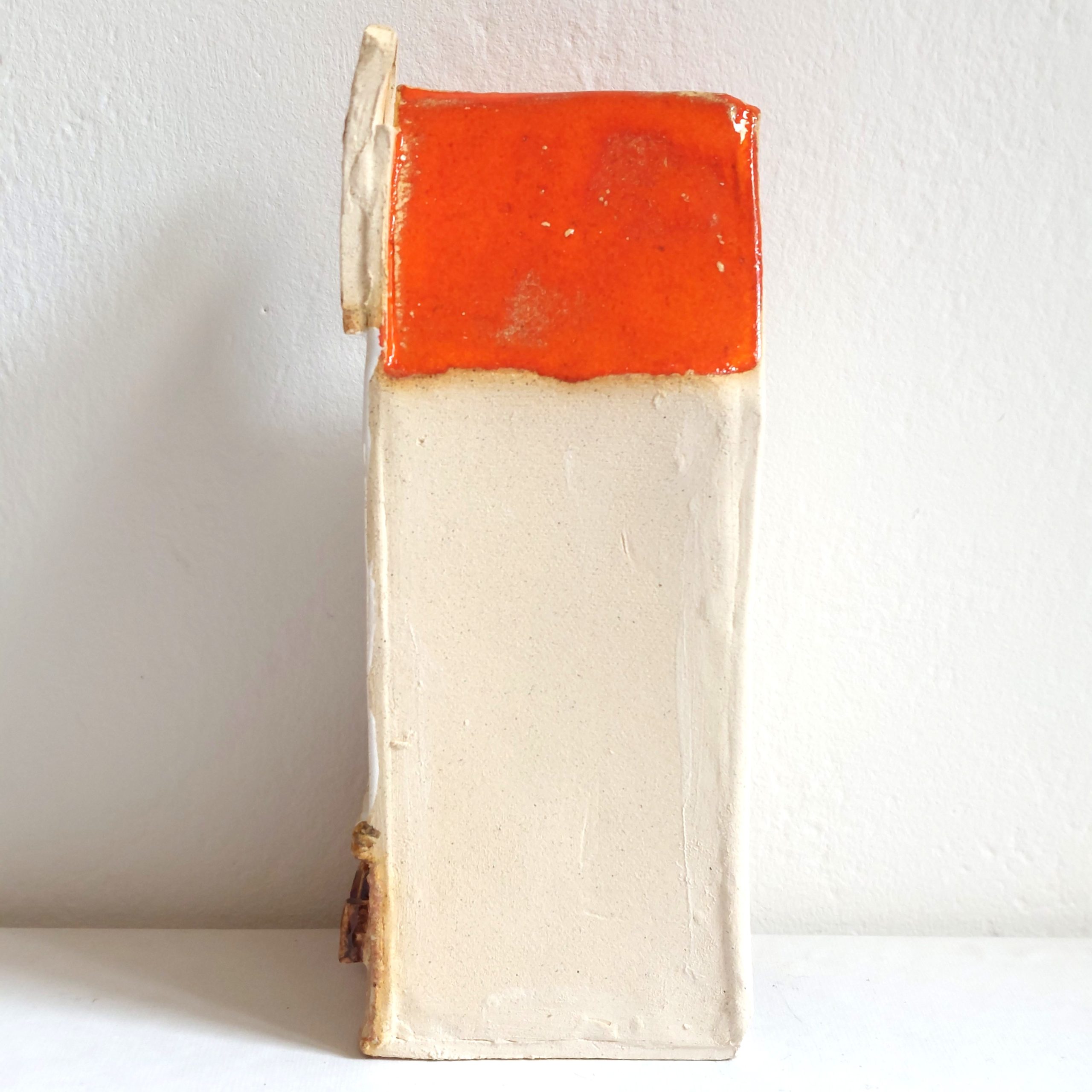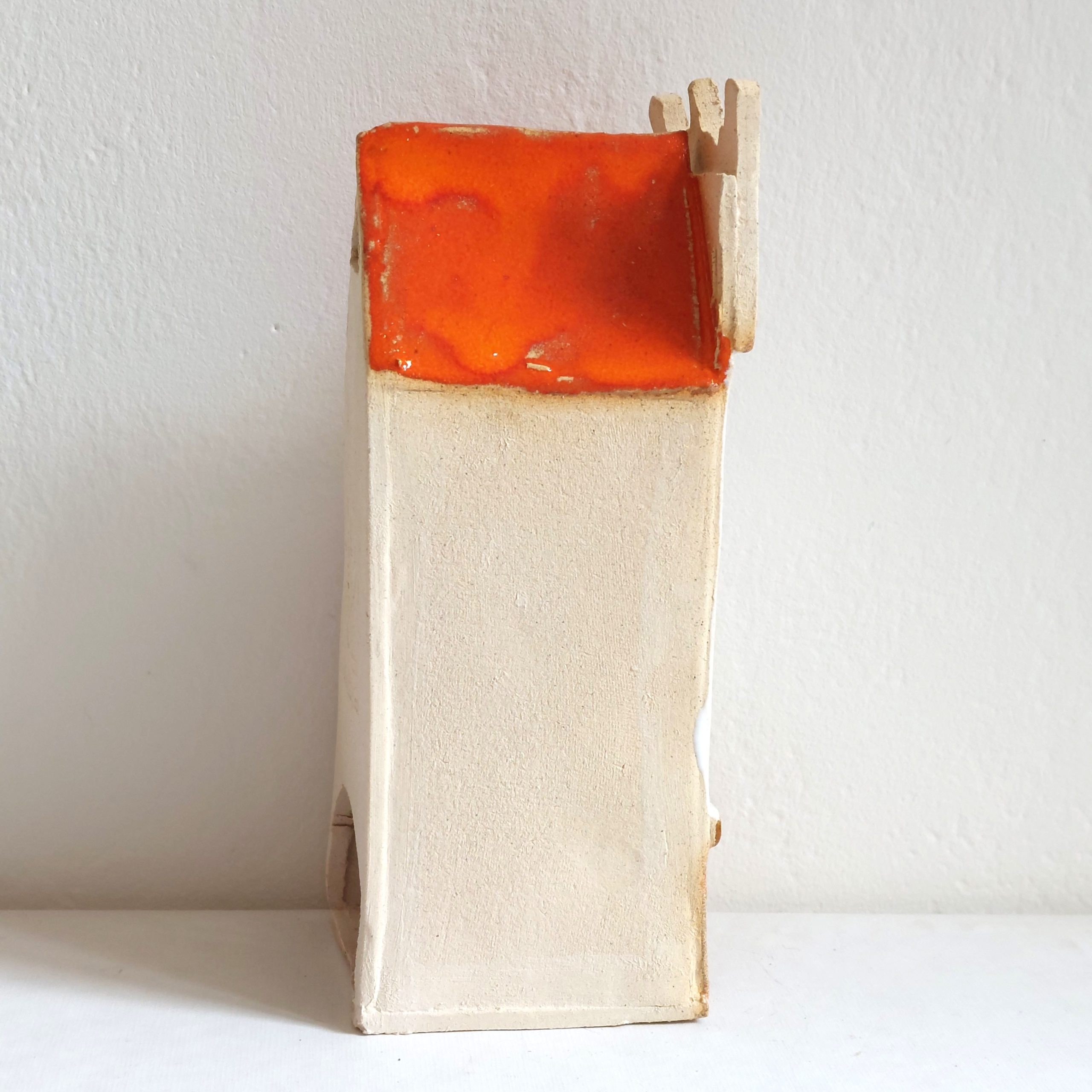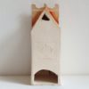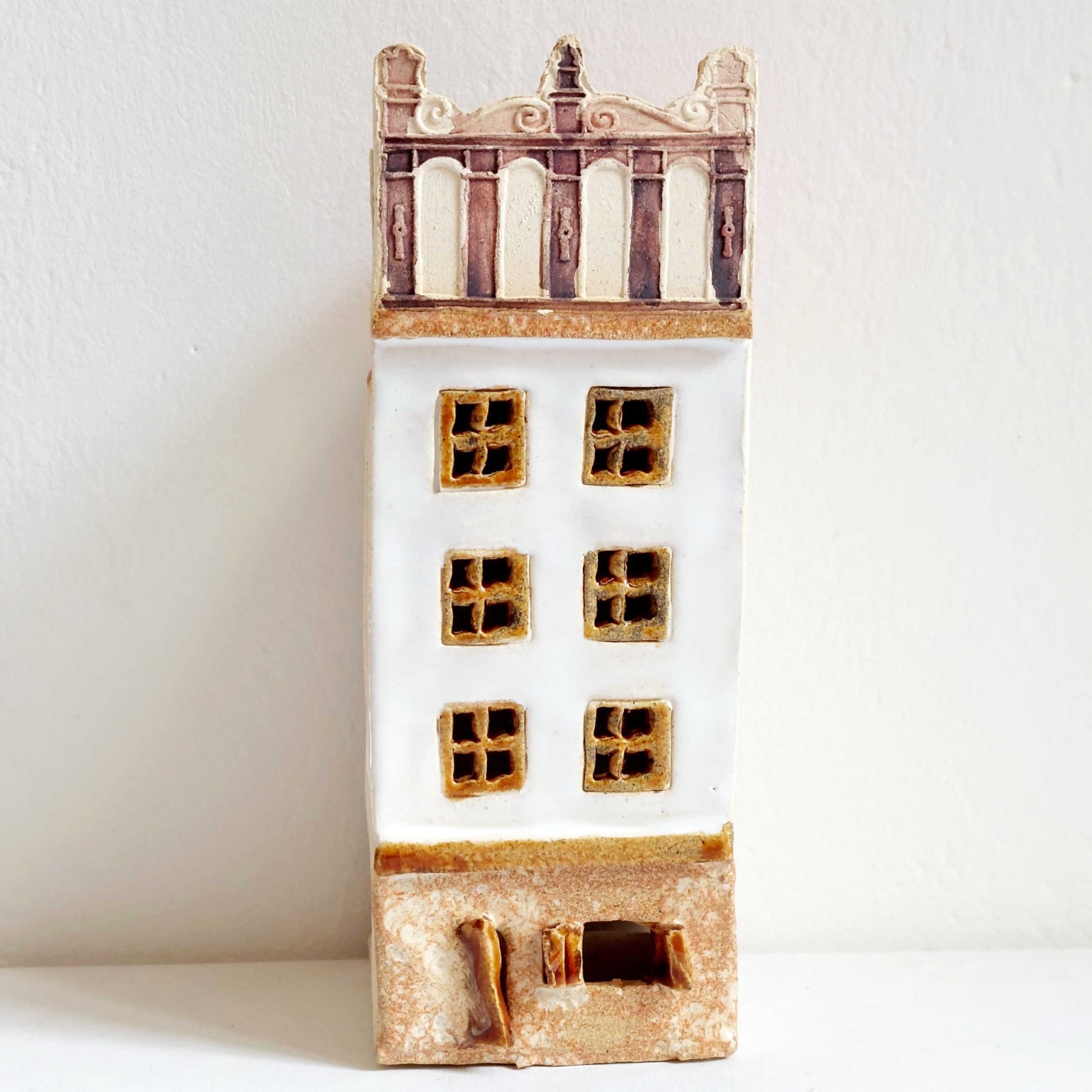 ceramiczny lampion kamieniczka z otworem na niską świece typu tealight. Wymiary lampionu: wysokość około 16 cm, szerokość 6 cm, głębokość 6 cm.