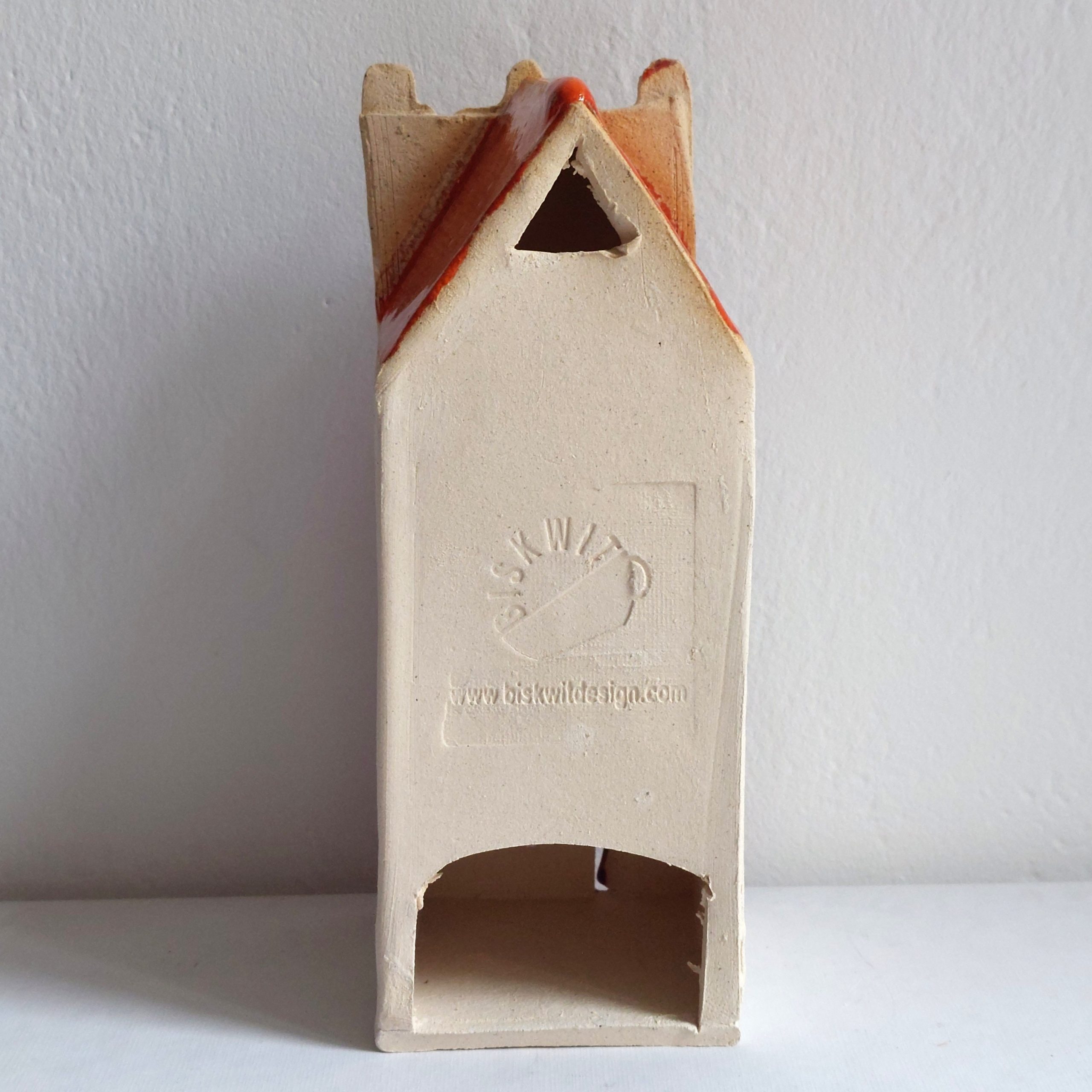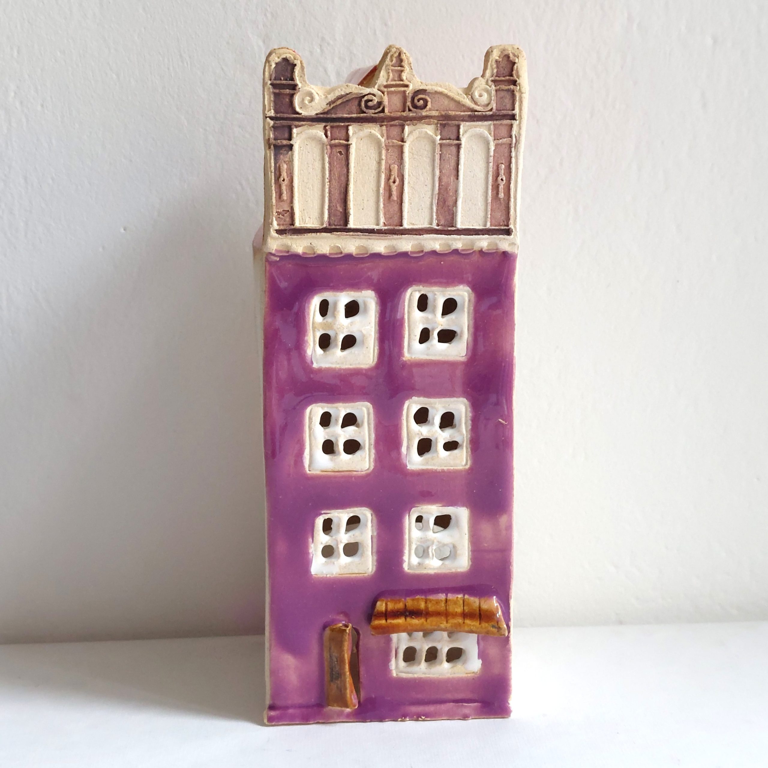ceramiczny lampion kamieniczka z otworem na niską świece typu tealight. Wymiary lampionu: wysokość około 16 cm, szerokość 6 cm, głębokość 6 cm.