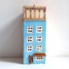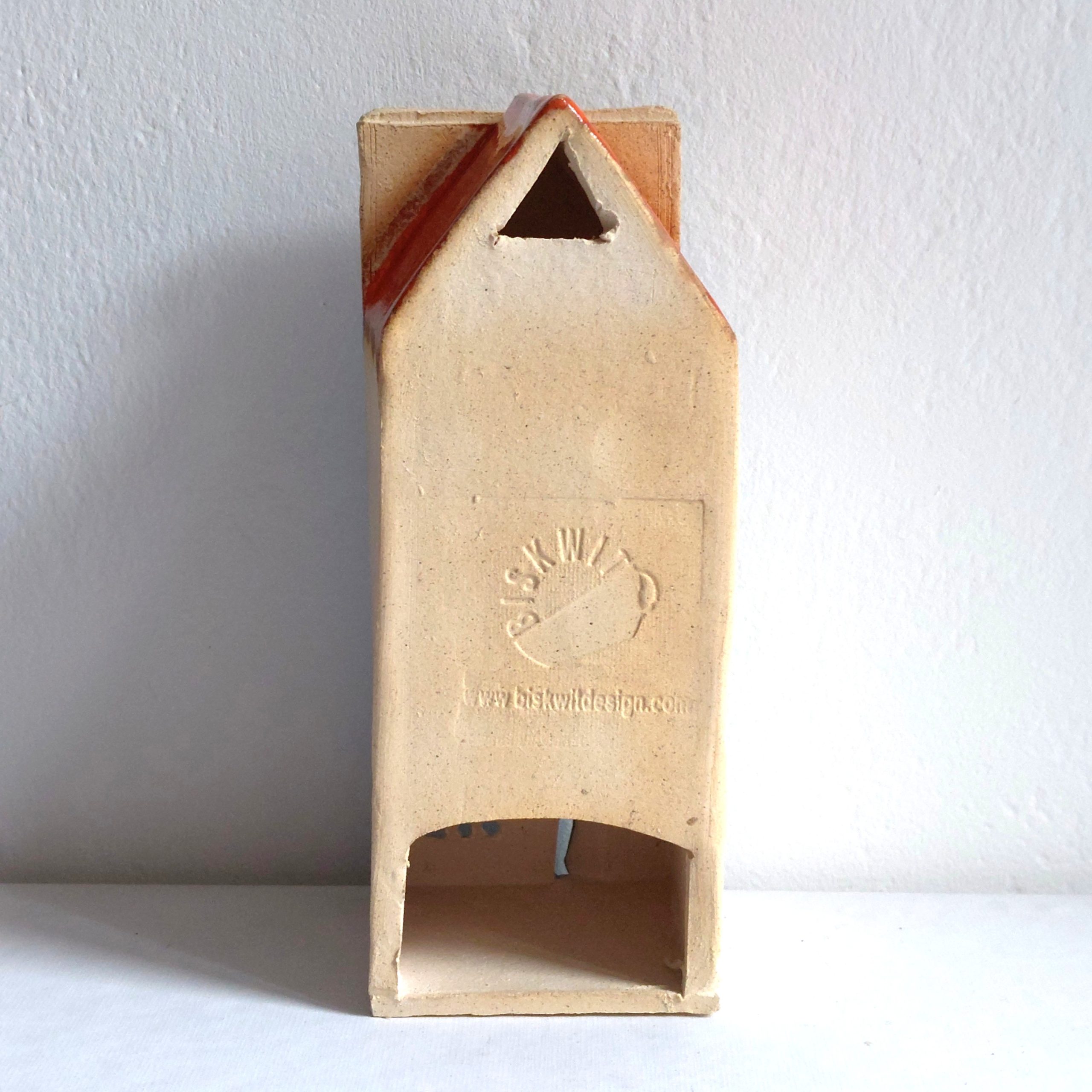ceramiczny lampion kamieniczka z otworem na niską świece typu tealight. Wymiary lampionu: wysokość około 16 cm, szerokość 6 cm, głębokość 6 cm.