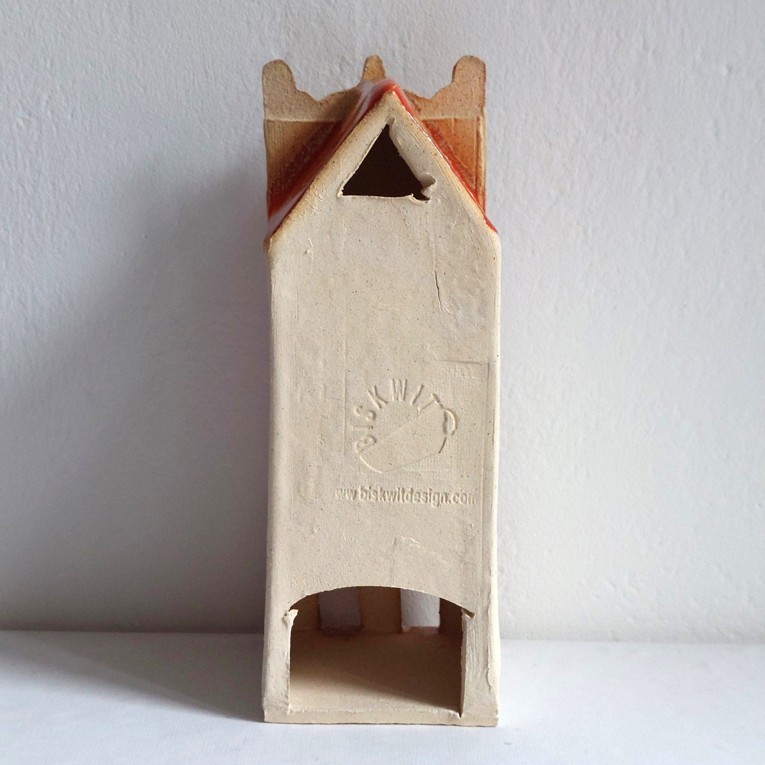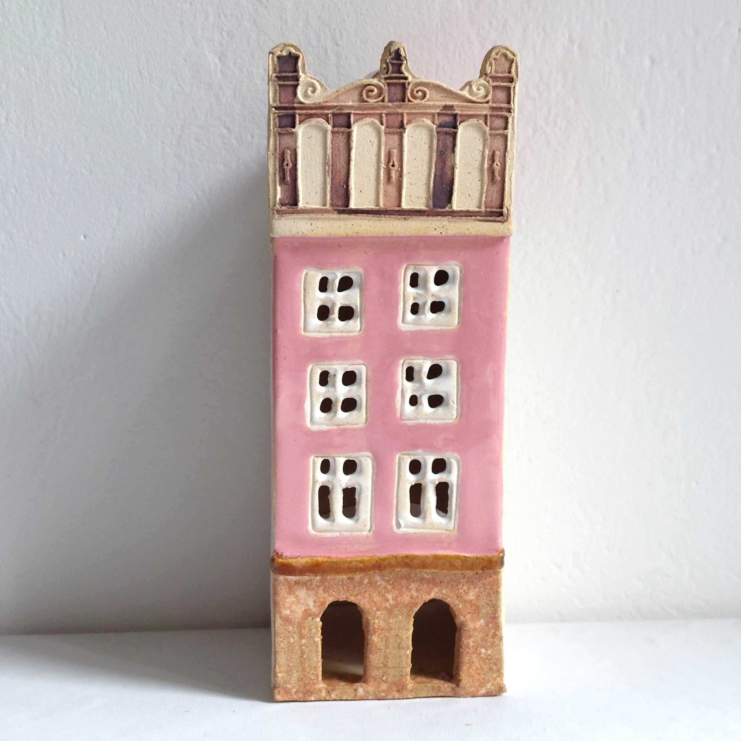 ceramiczny lampion kamieniczka z otworem na niską świece typu tealight. Wymiary lampionu: wysokość około 16 cm, szerokość 6 cm, głębokość 6 cm.