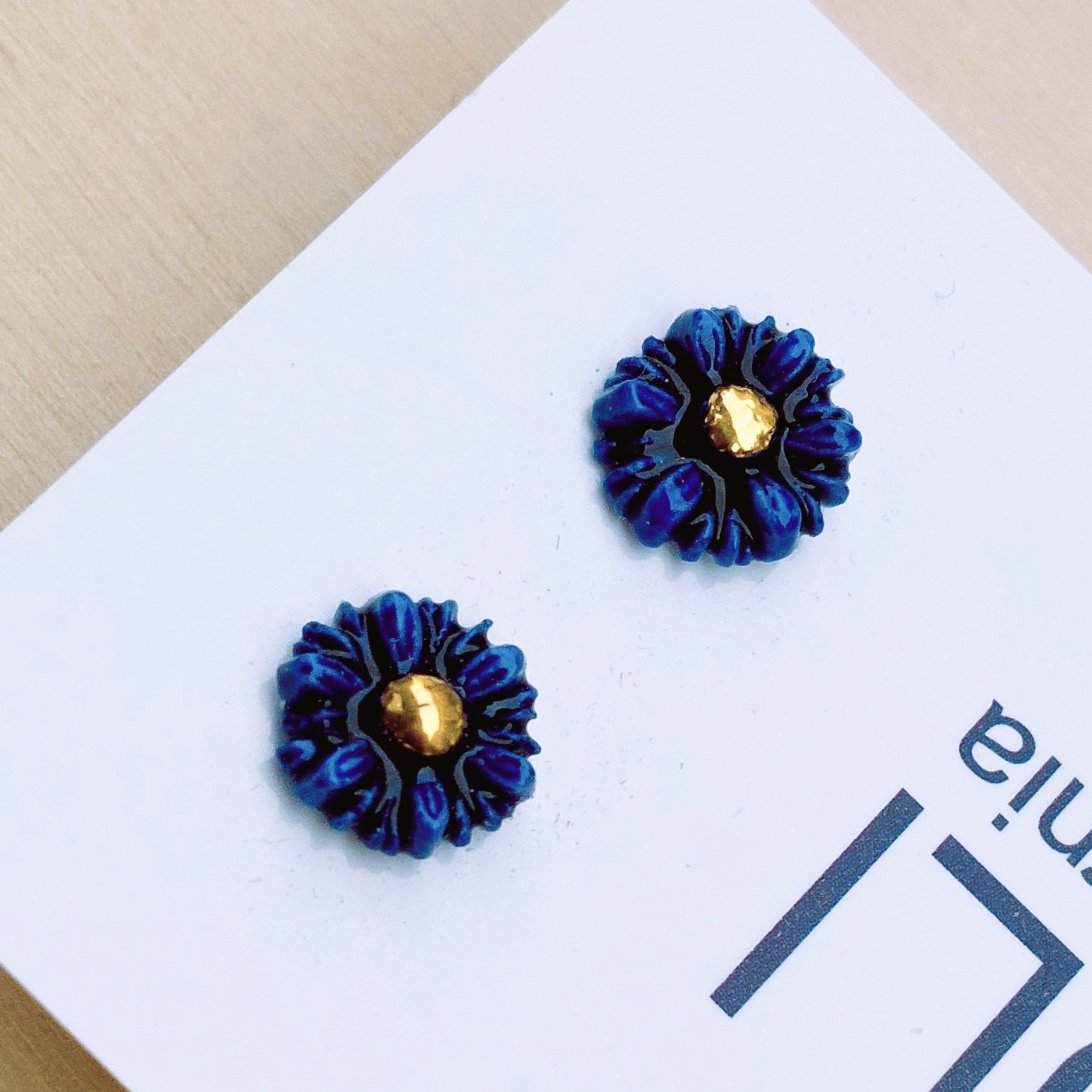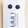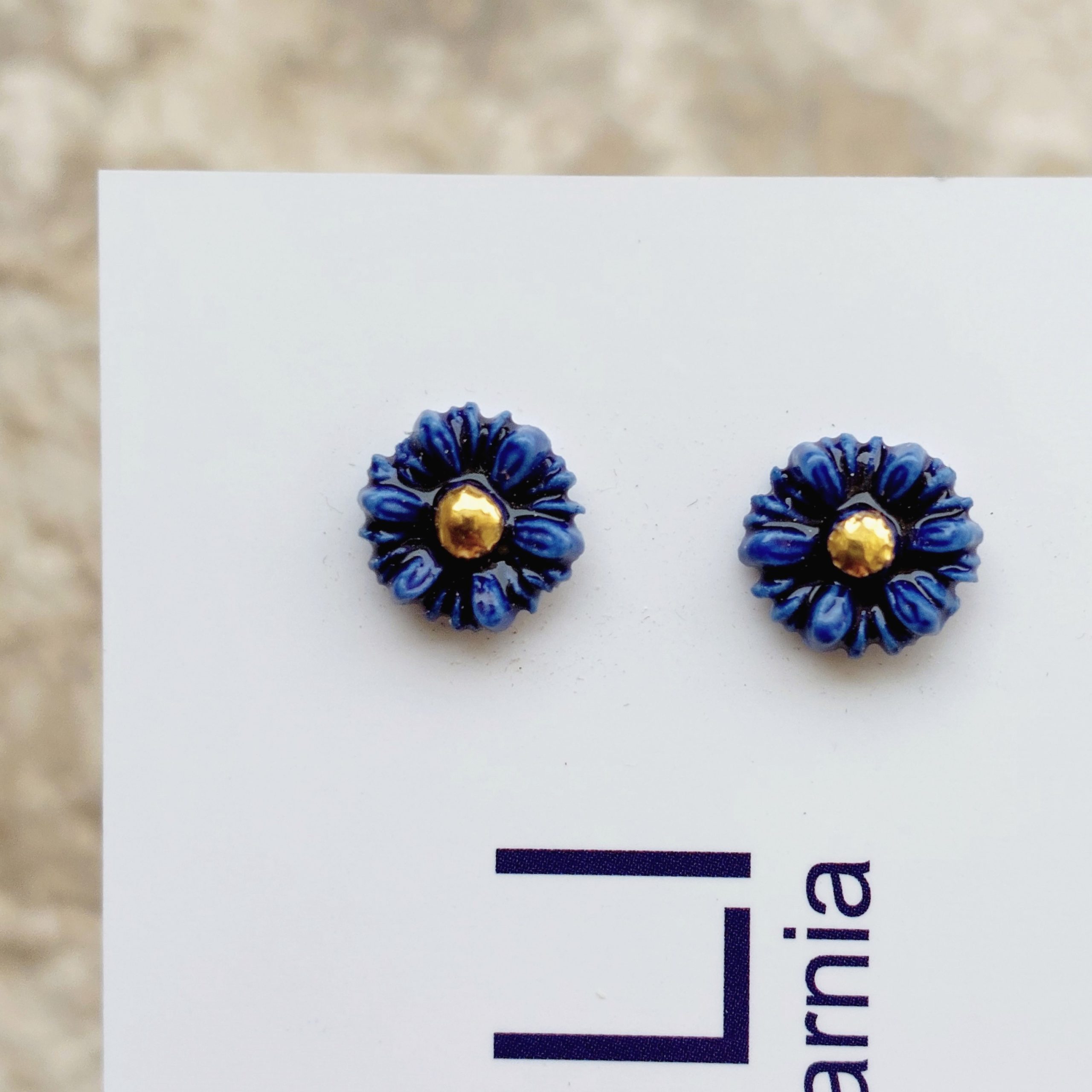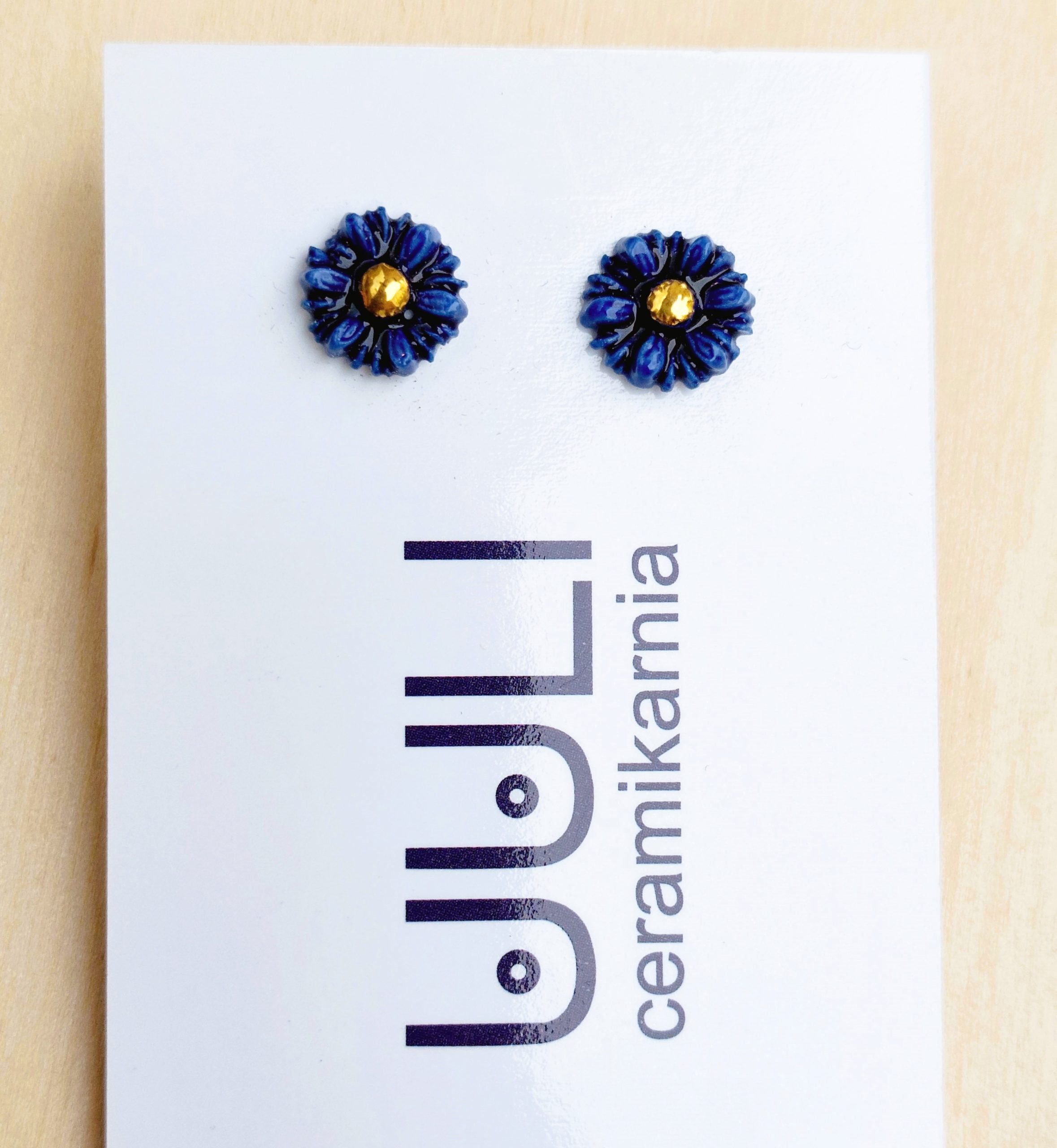 porcelanowe pozłacane kolczyki wkrętki kwiatuszki wykonane ręcznie w pracowni Ceramiki i Porcelany UUli. Kolczyki są ręcznie formowane, wygładzane, malowane szkliwem i na koniec ozdabiane płynnym, 24-karatowym złotem, mocowane na srebrnym sztyfcie z zatyczką silikonową, rozmiar: średnica około 9 mm