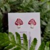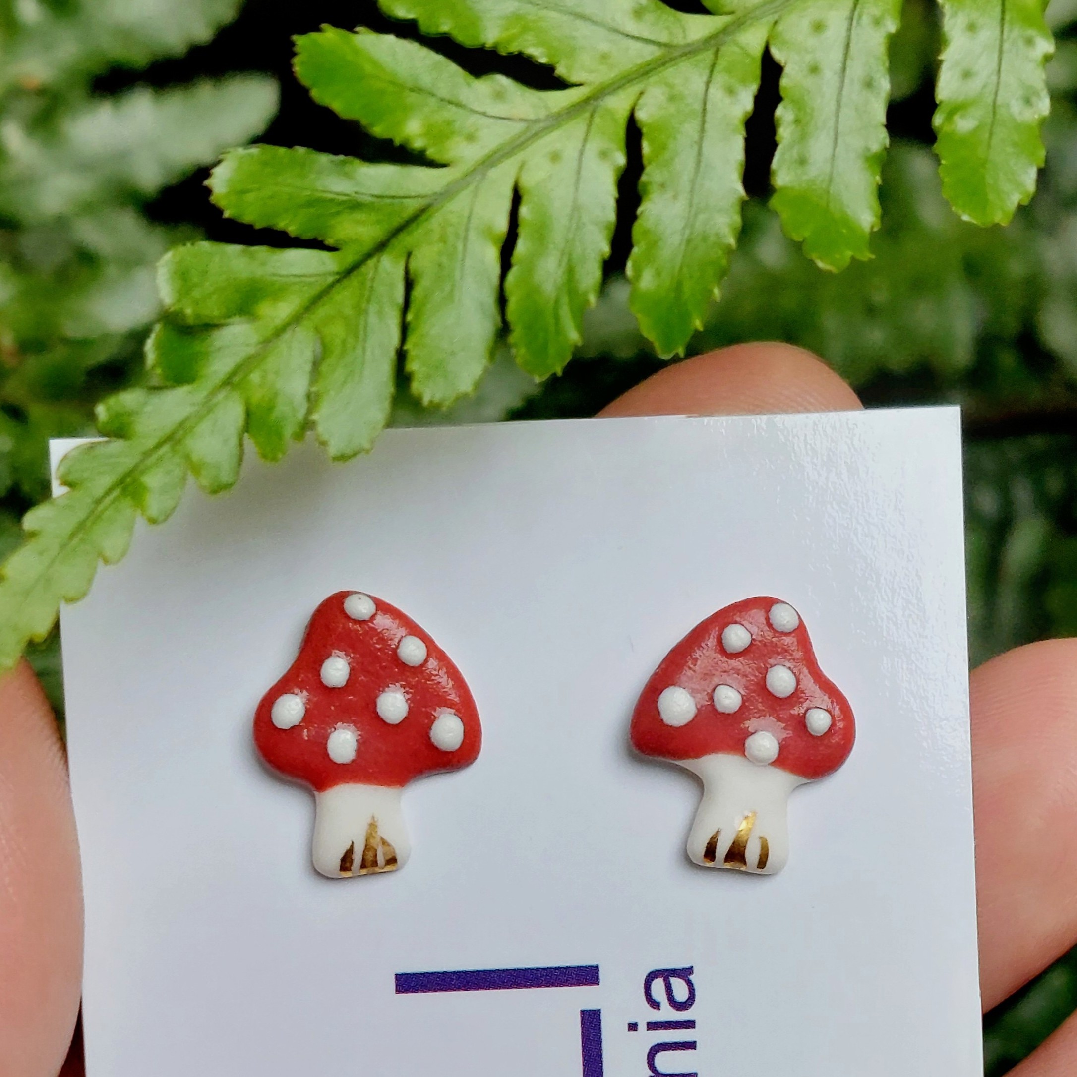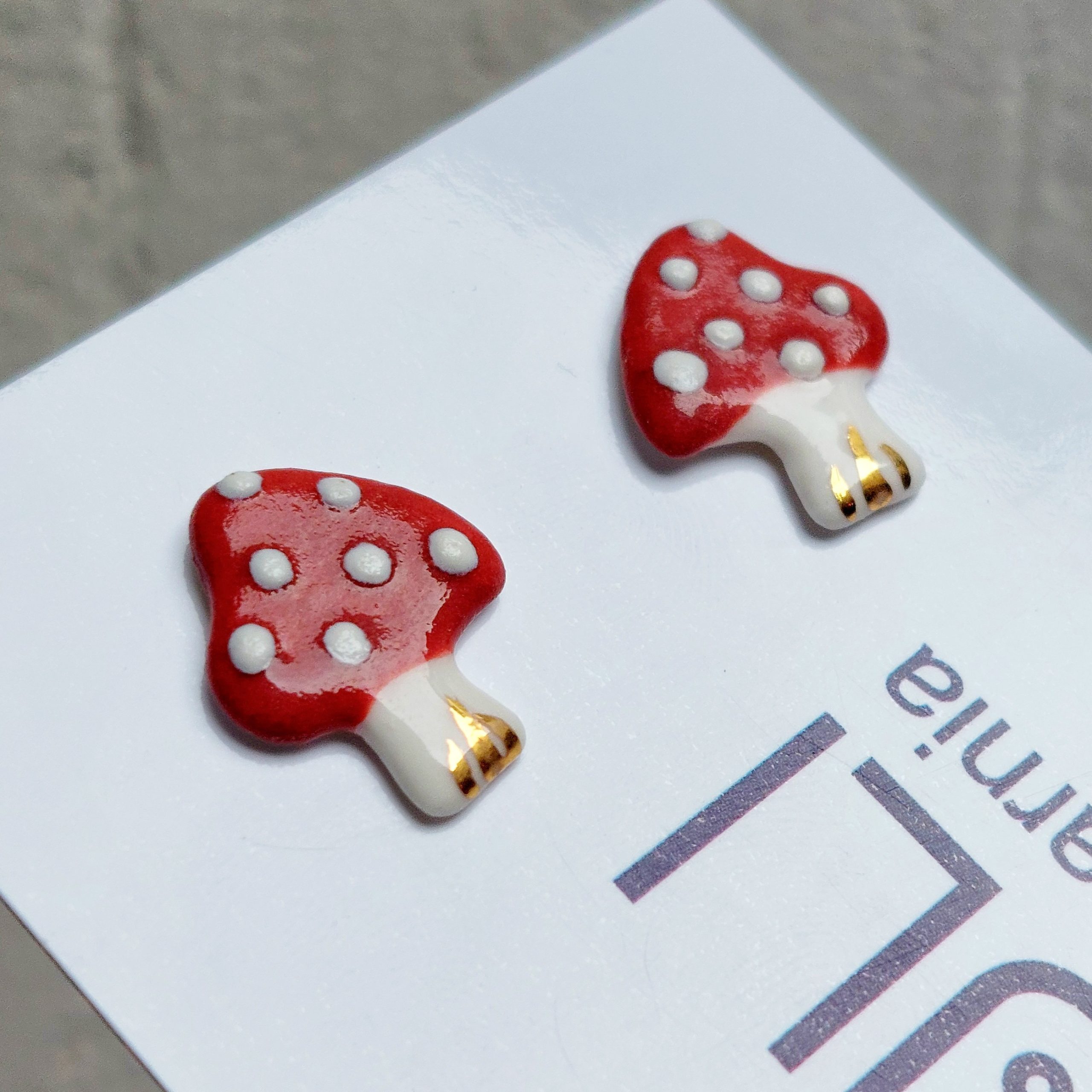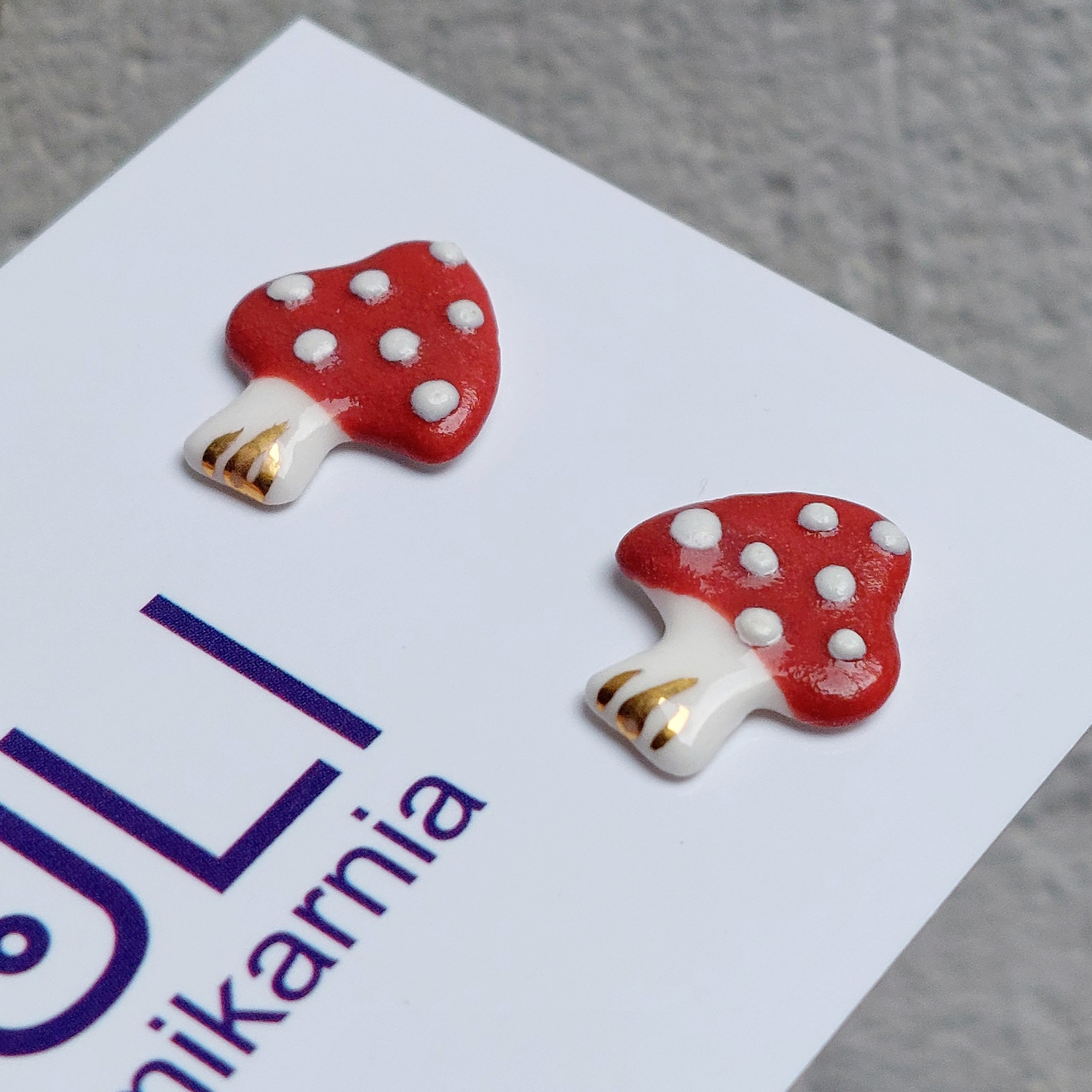porcelanowe pozłacane kolczyki wkrętki muchomory wykonane ręcznie w pracowni Ceramiki i Porcelany UUli. Kolczyki są ręcznie formowane, wygładzane, malowane szkliwem i na koniec ozdabiane płynnym, 24-karatowym złotem, mocowane na srebrnym sztyfcie z zatyczką silikonową, rozmiar: wysokość około 20 mm