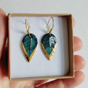 porcelanowe kolczyki wiszące dekorowane platyną. Wykonane ręcznie listki w pracowni Ceramiki i Porcelany UUli. Kolczyki są ręcznie formowane, wygładzane, malowane szkliwem i na koniec ozdabiane platyną, wiszące na srebrnym biglu z zapięciem, wysokość listków około 2,5cm
