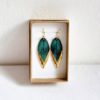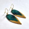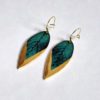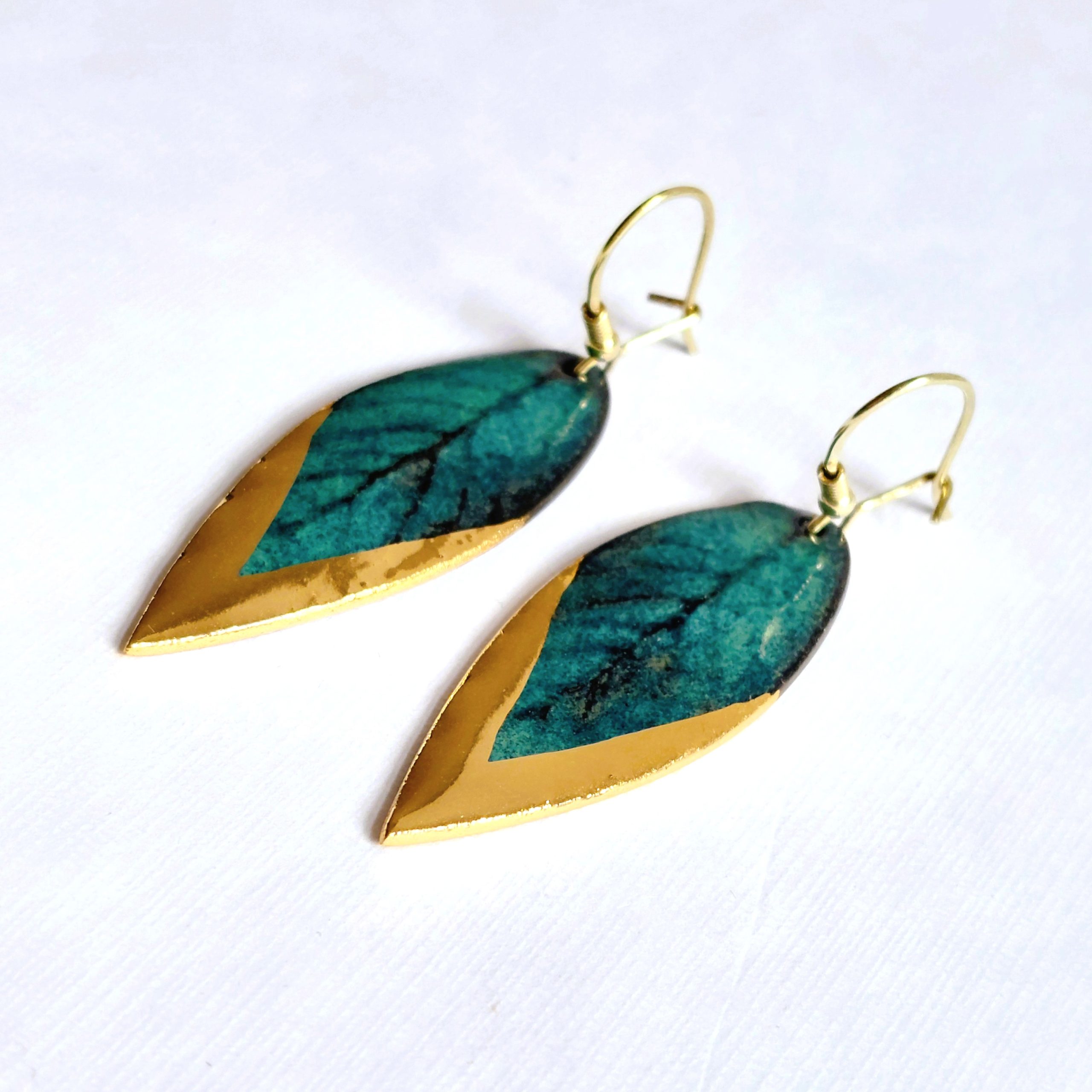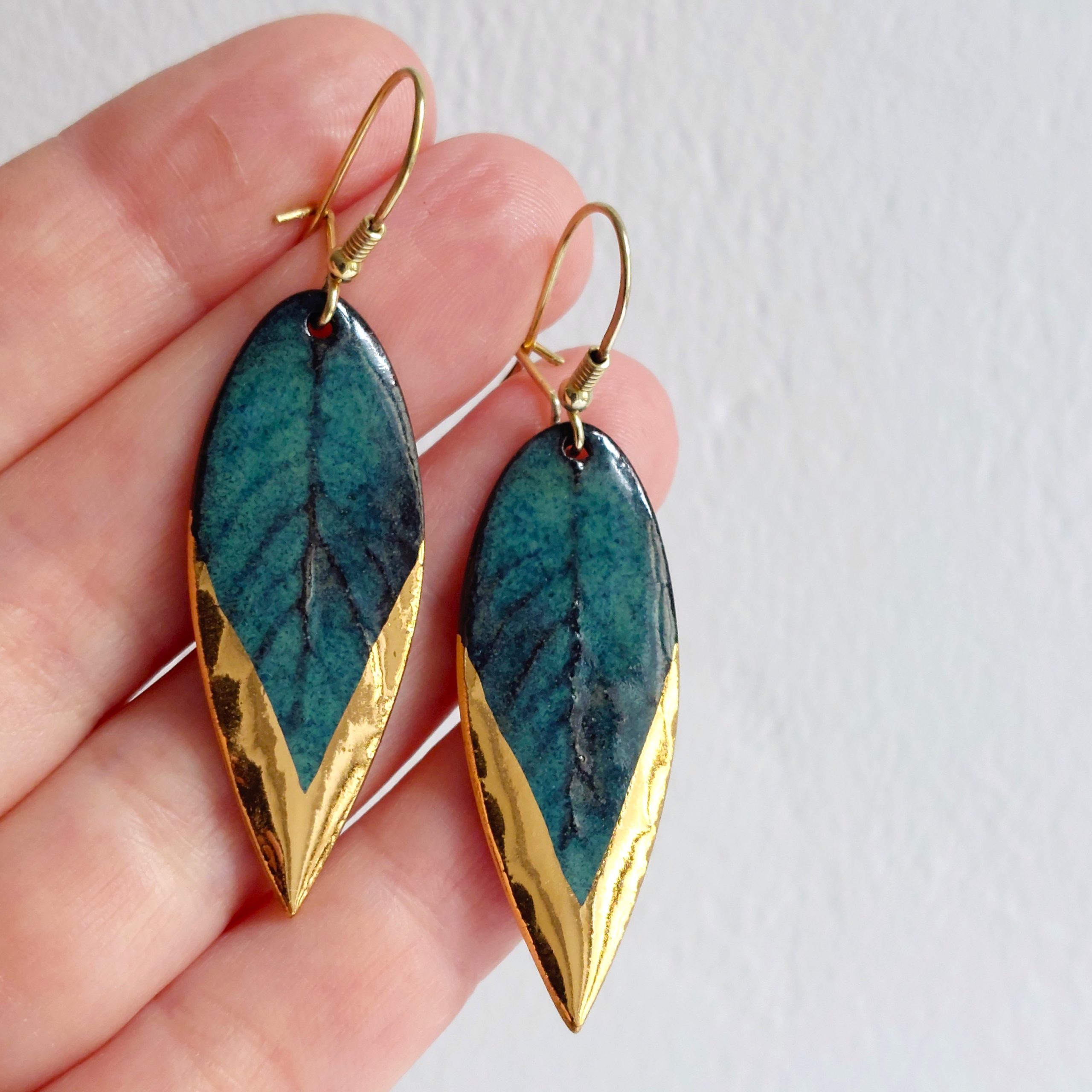 Wykonane ręcznie listki w pracowni Ceramiki i Porcelany UUli. Kolczyki są ręcznie formowane, wygładzane, malowane szkliwem i na koniec ozdabiane płynnym złotem, wiszące na biglu srebrnym pozłacanym, zapinanym, długość kolczyków około 4,5 cm