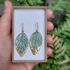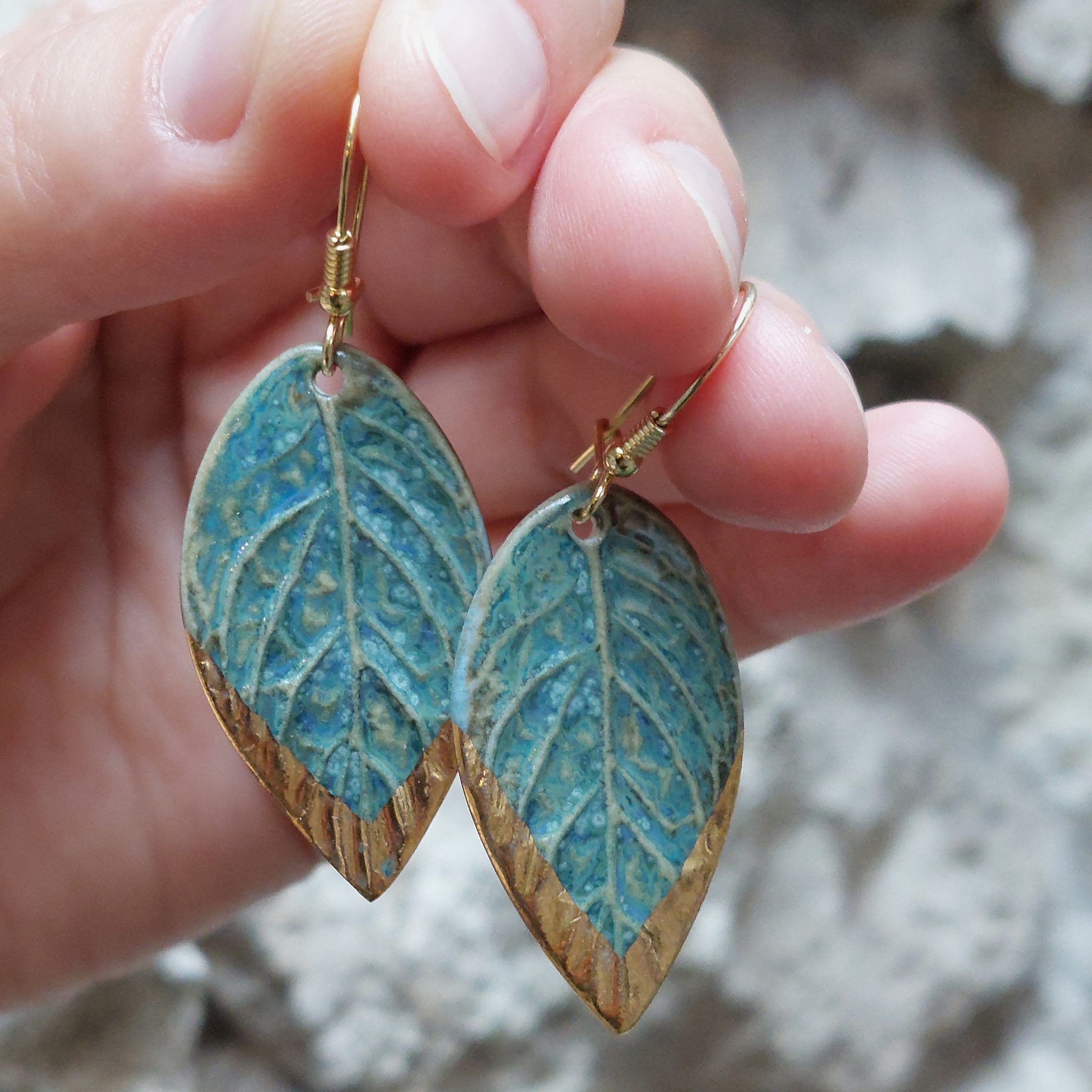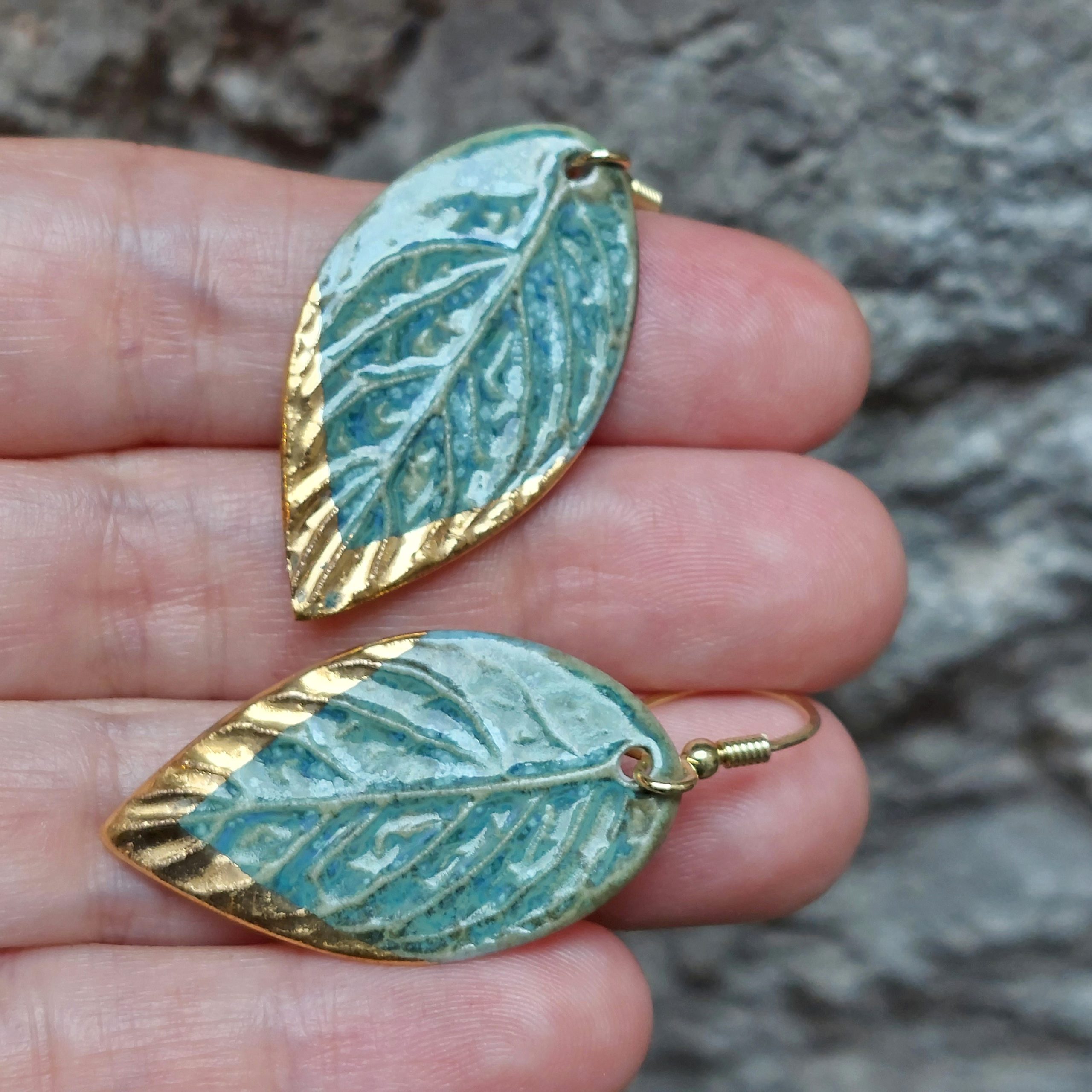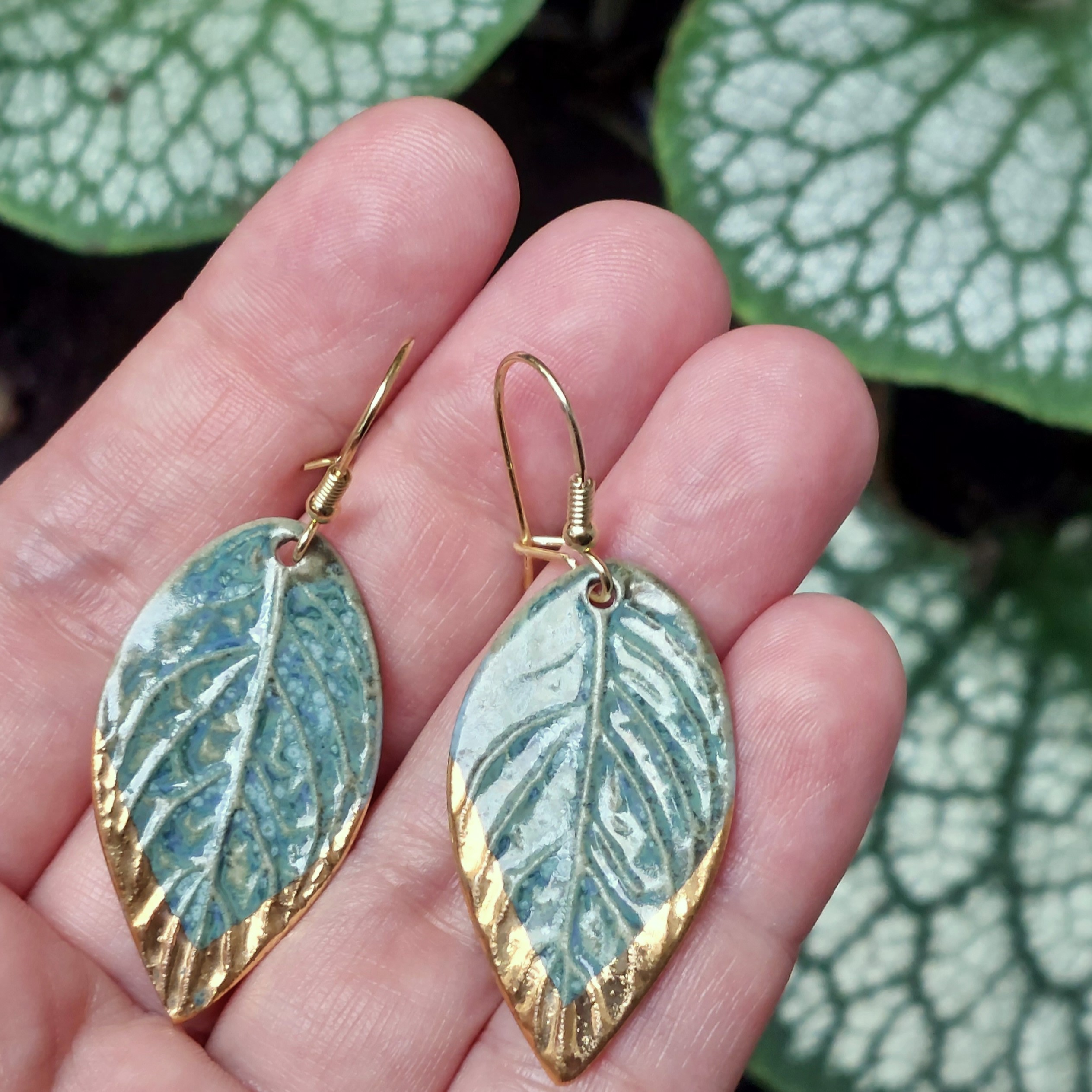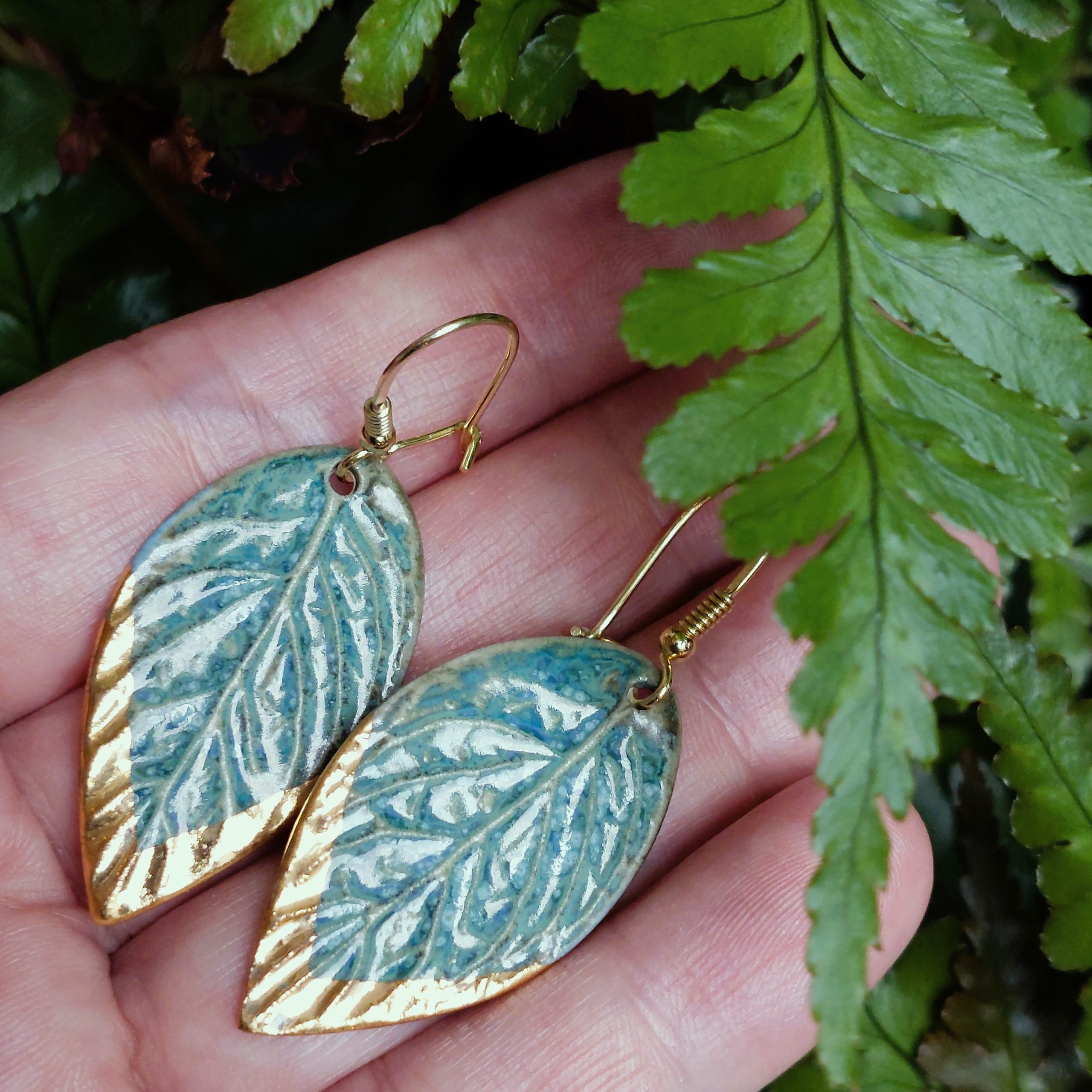 porcelanowe pozłacane kolczyki wiszące wykonane ręcznie w pracowni Ceramiki i Porcelany UUli. Kolczyki są ręcznie formowane, wygładzane, malowane szkliwem i na koniec ozdabiane płynnym, 24-karatowym złotem, wiszące na biglu z zapięciem srebrnym pozłacanym, wysokość listków 3,5cm, szerokość 2cm