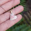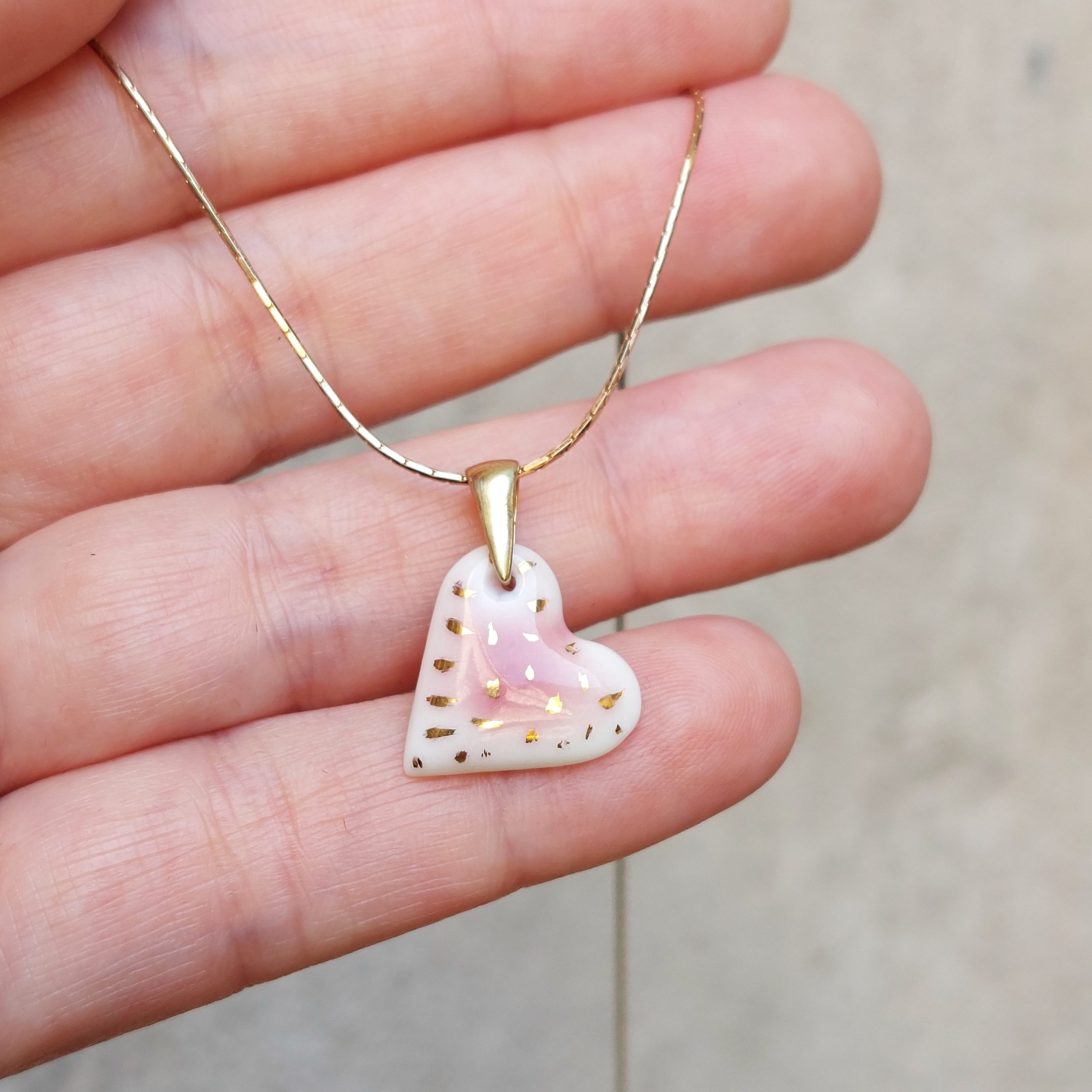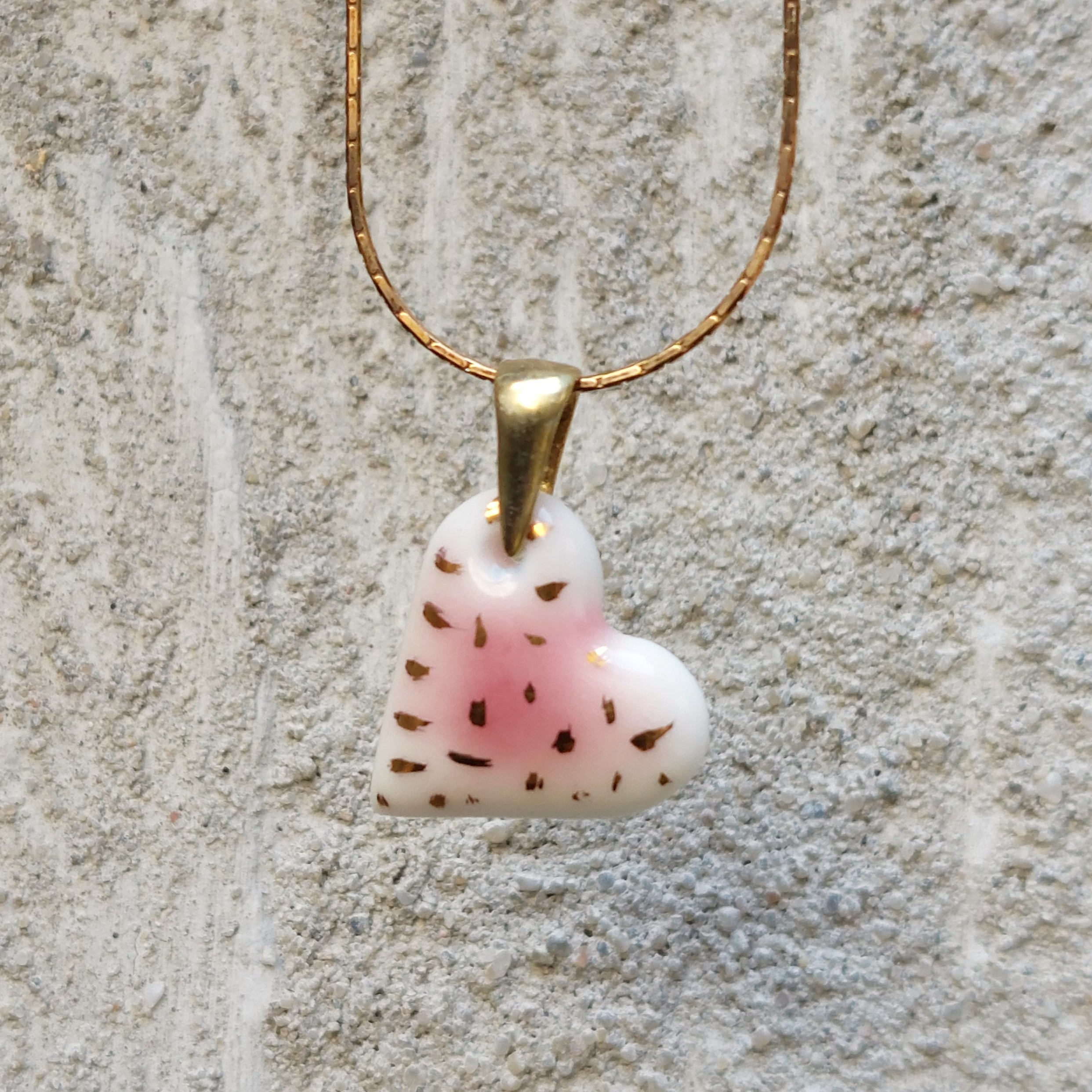 Wykonane ręcznie serduszko w pracowni Ceramiki i Porcelany UUli na zawieszce srebrnej pozłacanej i srebrnym łańcuszku pozłacanym. Wisiorek jest ręcznie formowany, malowany szkliwem, wygładzany i na koniec ozdabiany płynnym, 24-karatowym złotem, mocowany na srebrnej zawieszce pozłacanej w komplecie z łańcuszkiem srebrnym pozłacanym o długości 45 cm. Wymiary serduszka: wysokość 16 mm, szerokość 16 mm. Naszyjnik jest zapakowany w tekturowe pudełko biżuteryjne.