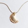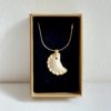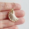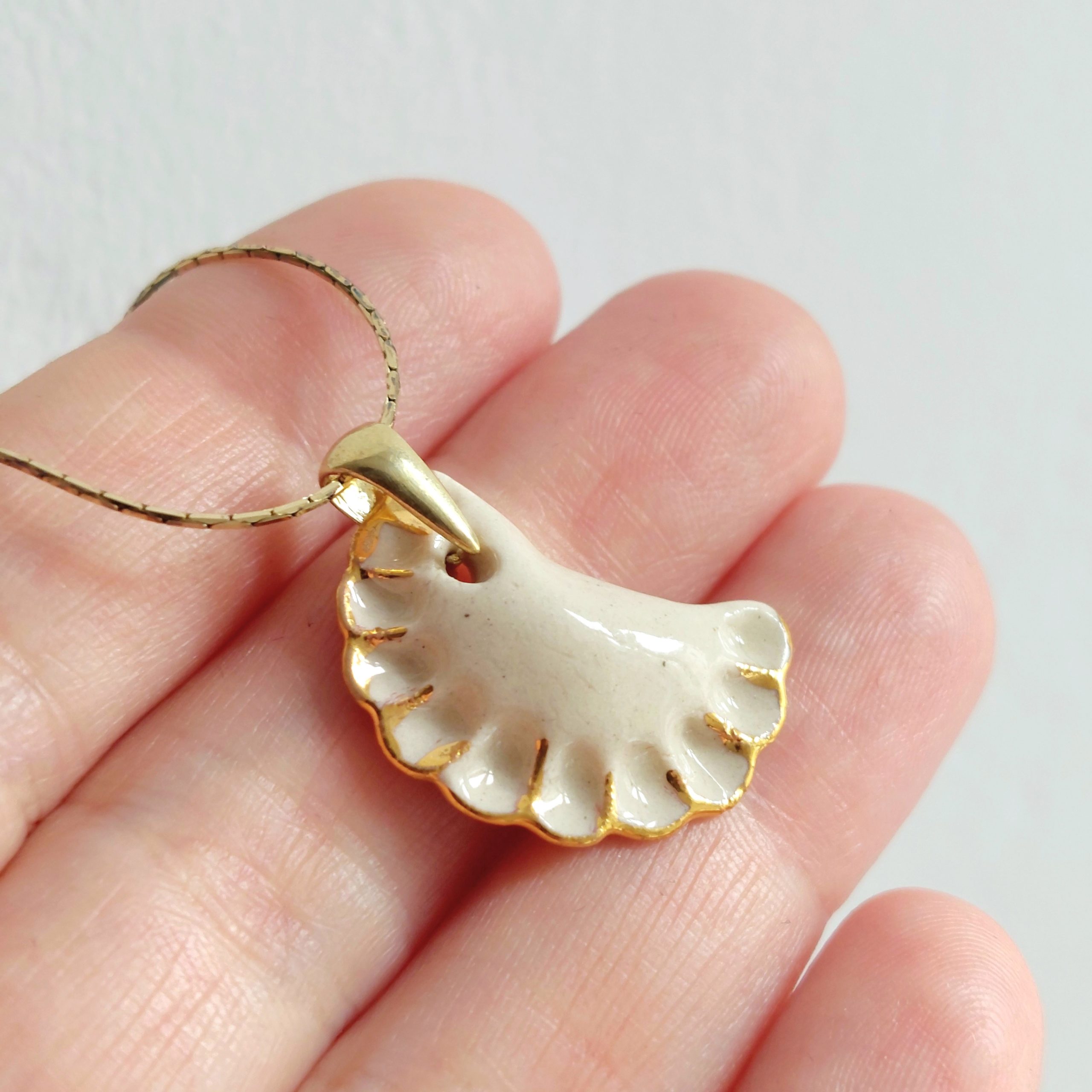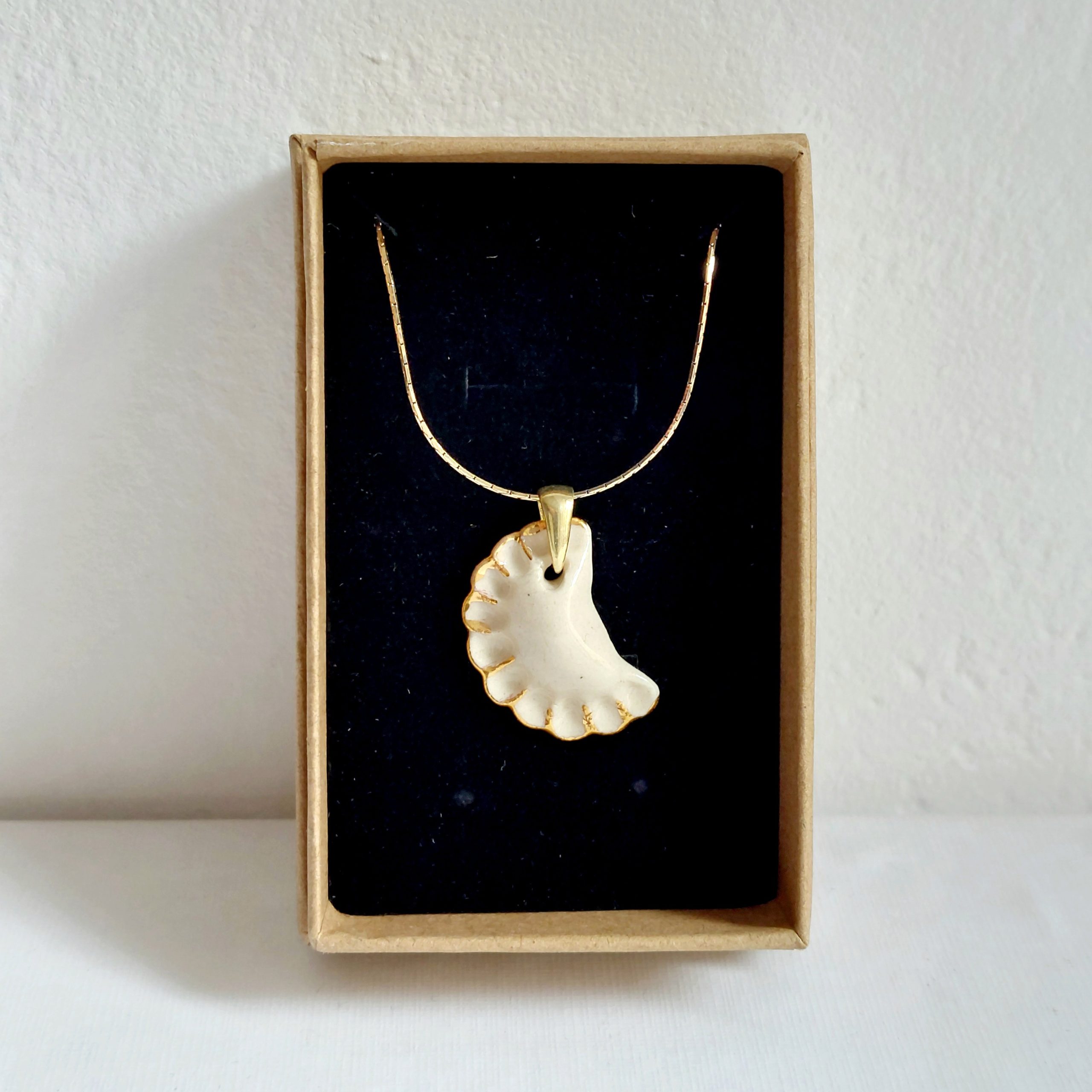 Wykonany ręcznie pieróg z porcelany w pracowni Ceramiki i Porcelany UUli. Wisiorek jest ręcznie formowany, wygładzany, malowany szkliwem i na koniec ozdobiony płynnym, 24-karatowym złotem, mocowany na srebrnej zawieszce pozłacanej w komplecie z łańcuszkiem srebrnym pozłacanym o długości 50 cm. Wymiary pieroga: wysokość 2 cm, szerokość 1,5 cm. Naszyjnik jest zapakowany w tekturowe pudełko biżuteryjne.