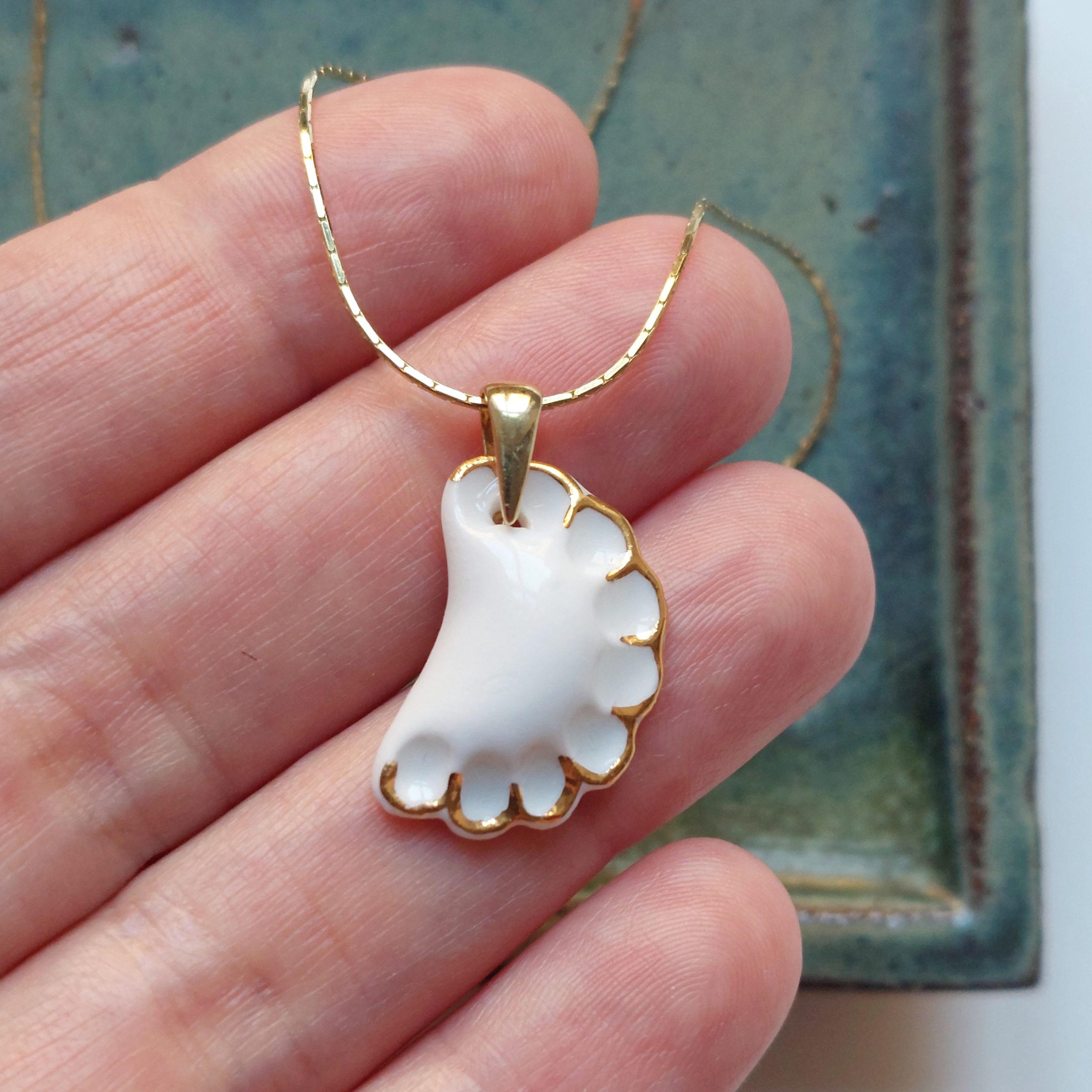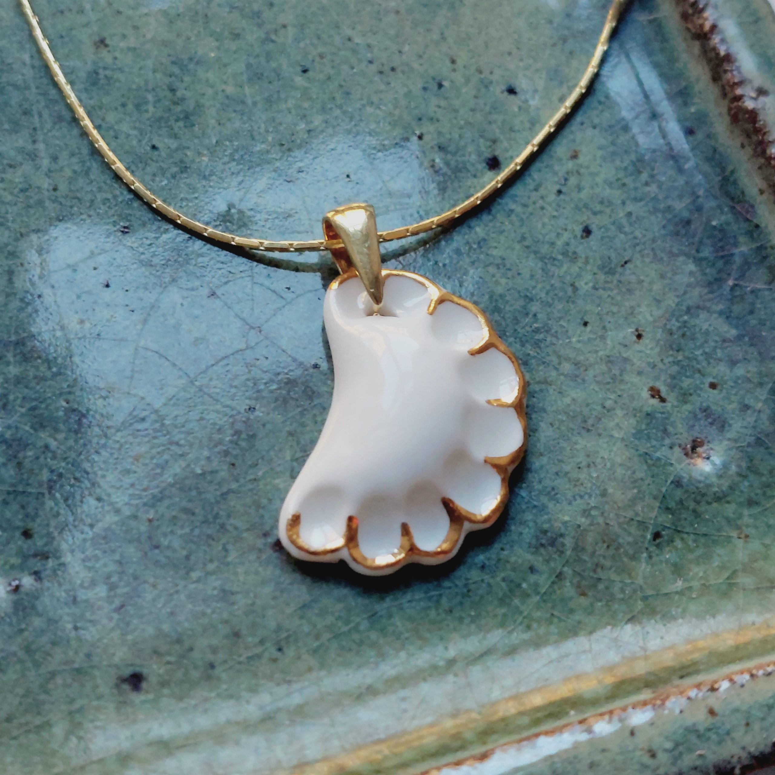 Wykonany ręcznie pieróg z porcelany w pracowni Ceramiki i Porcelany UUli. Wisiorek jest ręcznie formowany, wygładzany, malowany szkliwem i na koniec ozdobiony płynnym, 24-karatowym złotem, mocowany na srebrnej zawieszce pozłacanej w komplecie z łańcuszkiem srebrnym pozłacanym o długości 50 cm. Wymiary pieroga: wysokość  2 cm, szerokość 1,5 cm. Naszyjnik jest zapakowany w tekturowe pudełko biżuteryjne.