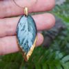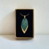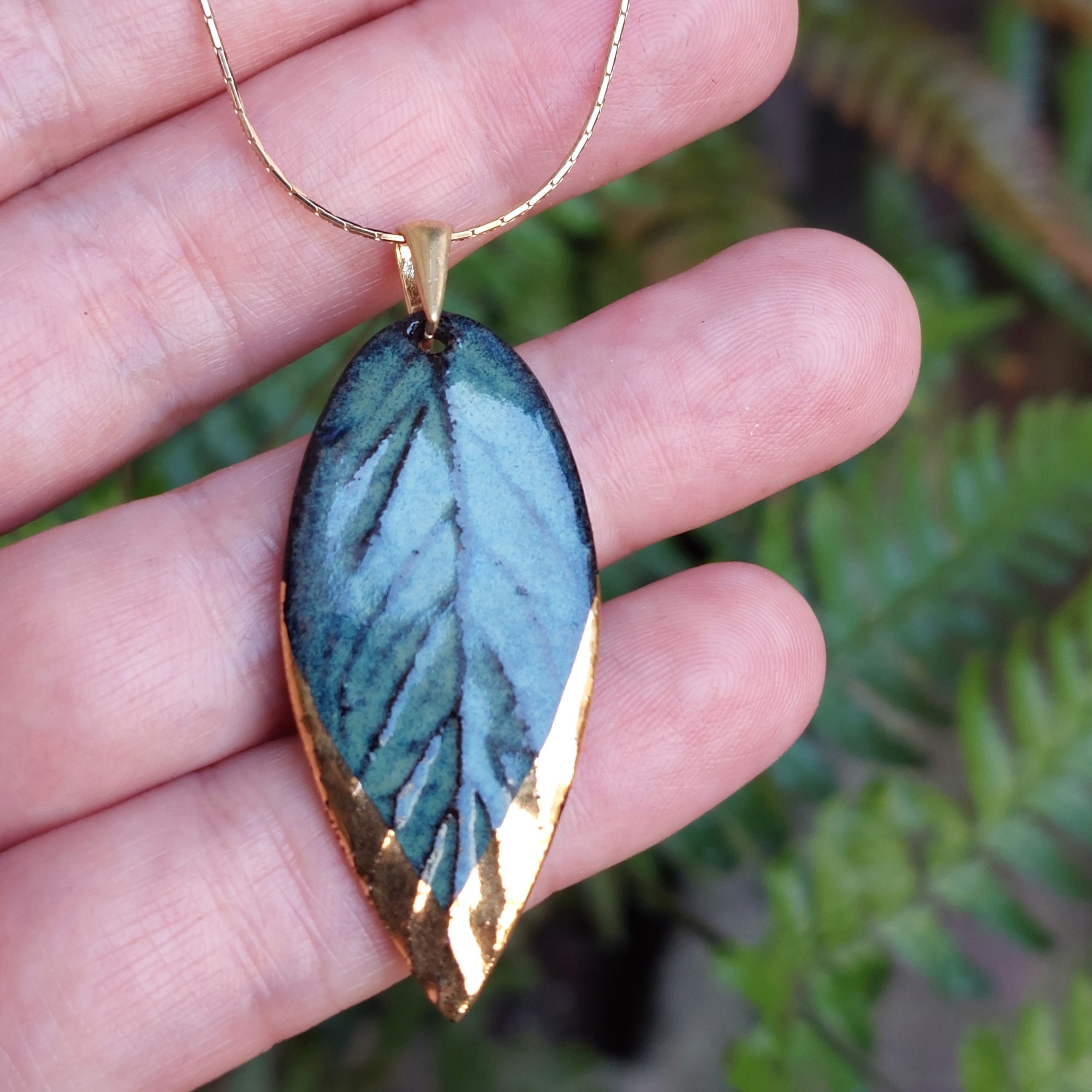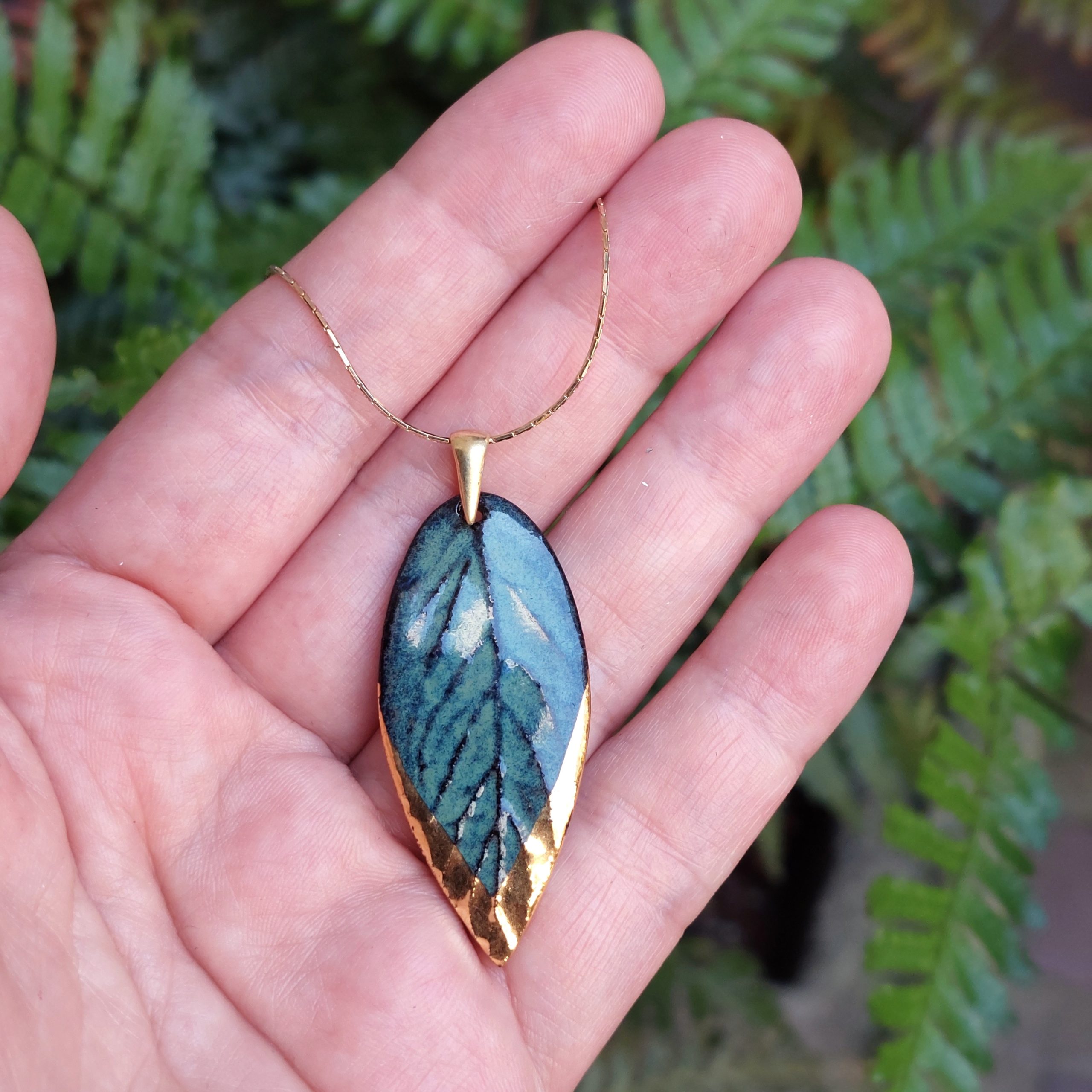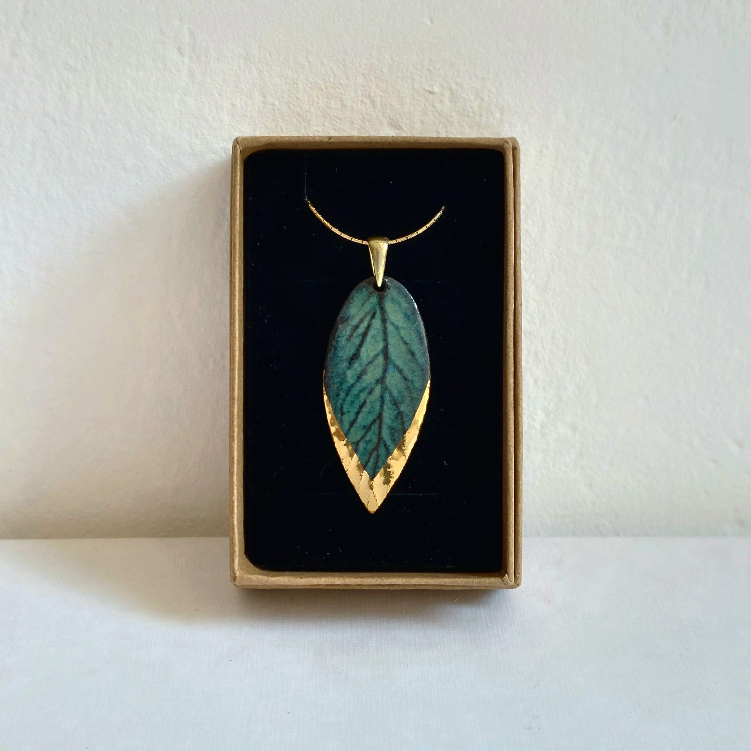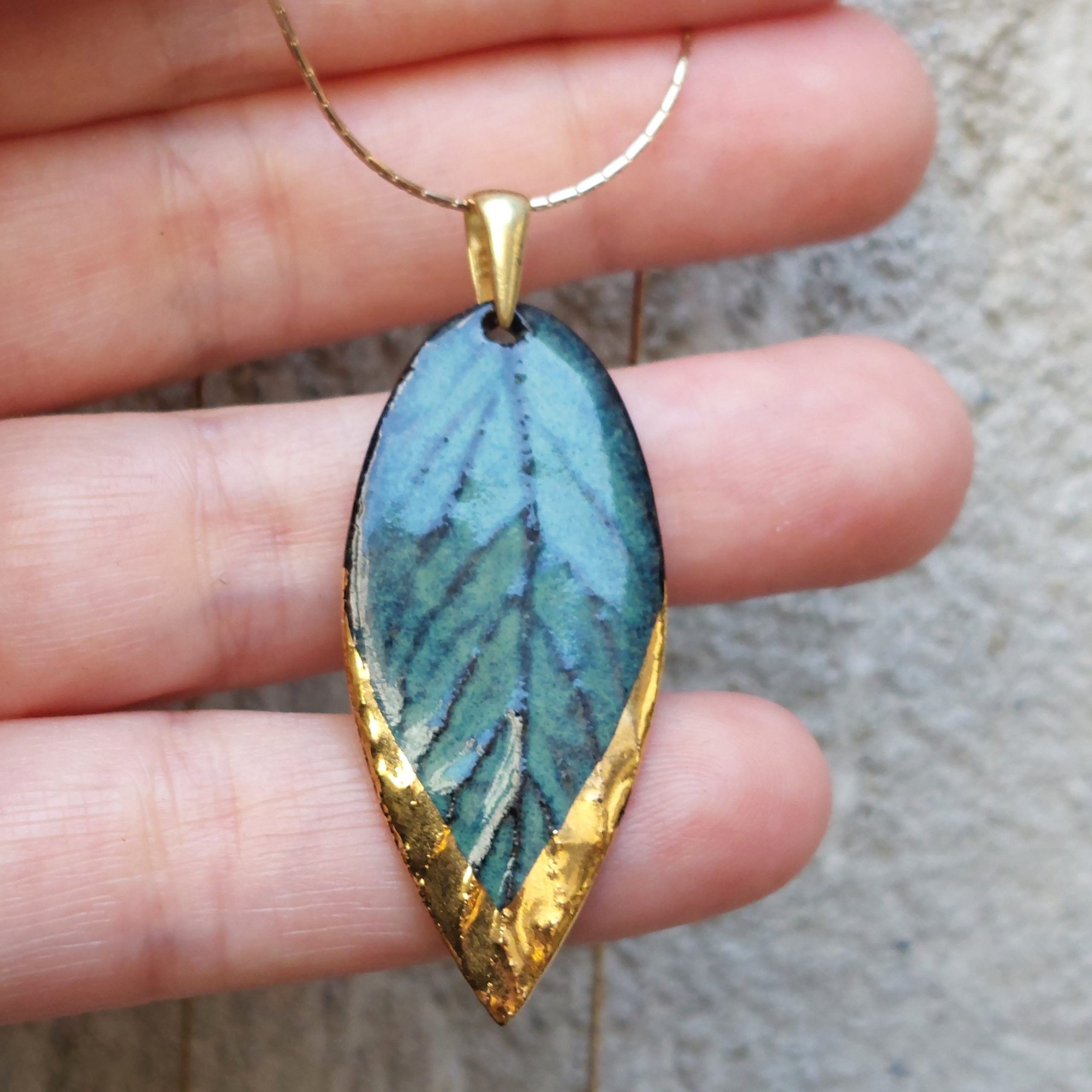 Wykonany ręcznie listek w pracowni Ceramiki i Porcelany UUli. Wisiorek jest ręcznie formowany, wygładzany, szkliwiony i na koniec ozdabiany płynnym, 24-karatowym złotem, mocowany na srebrnej zawieszce pozłacanej i zawieszony na srebrnym łańcuszku pozłacanym o długości 50 cm. Wymiary listka: wysokość 4,5 cm, szerokość 2 cm.